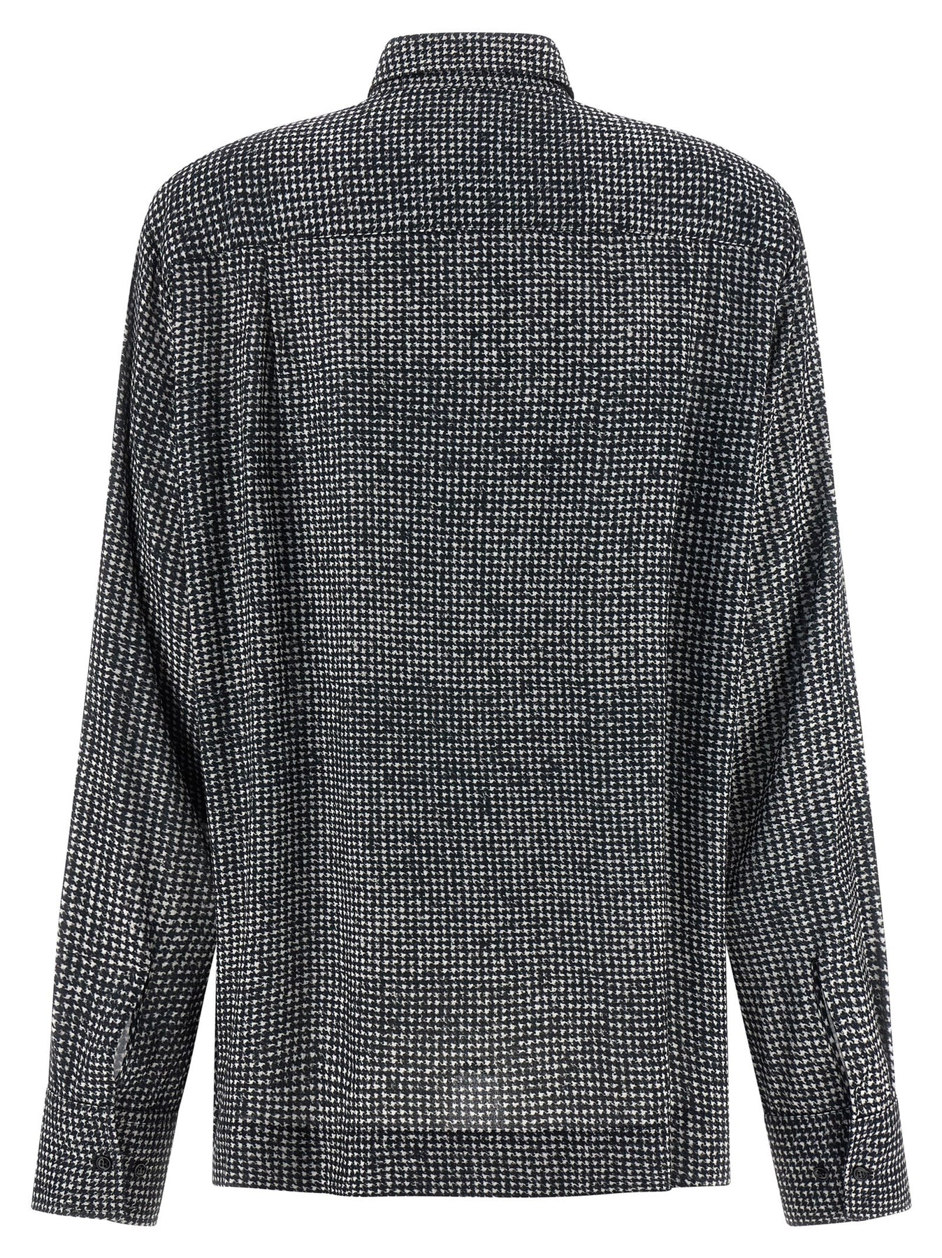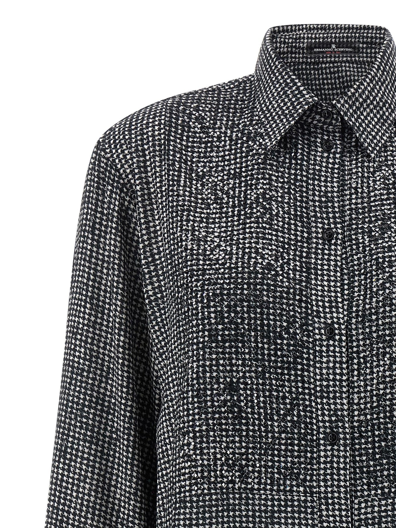 Fluid viscose shirt with houndstooth print, trompe l'oeil plastron with tone-on-tone rhinestone application, front button closure, long cuffed sleeves, side slits.