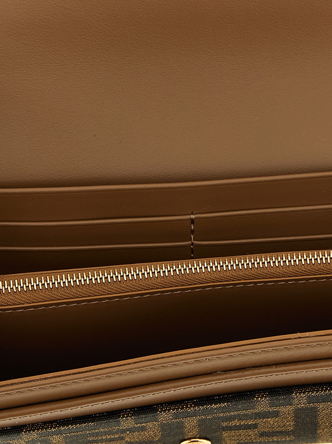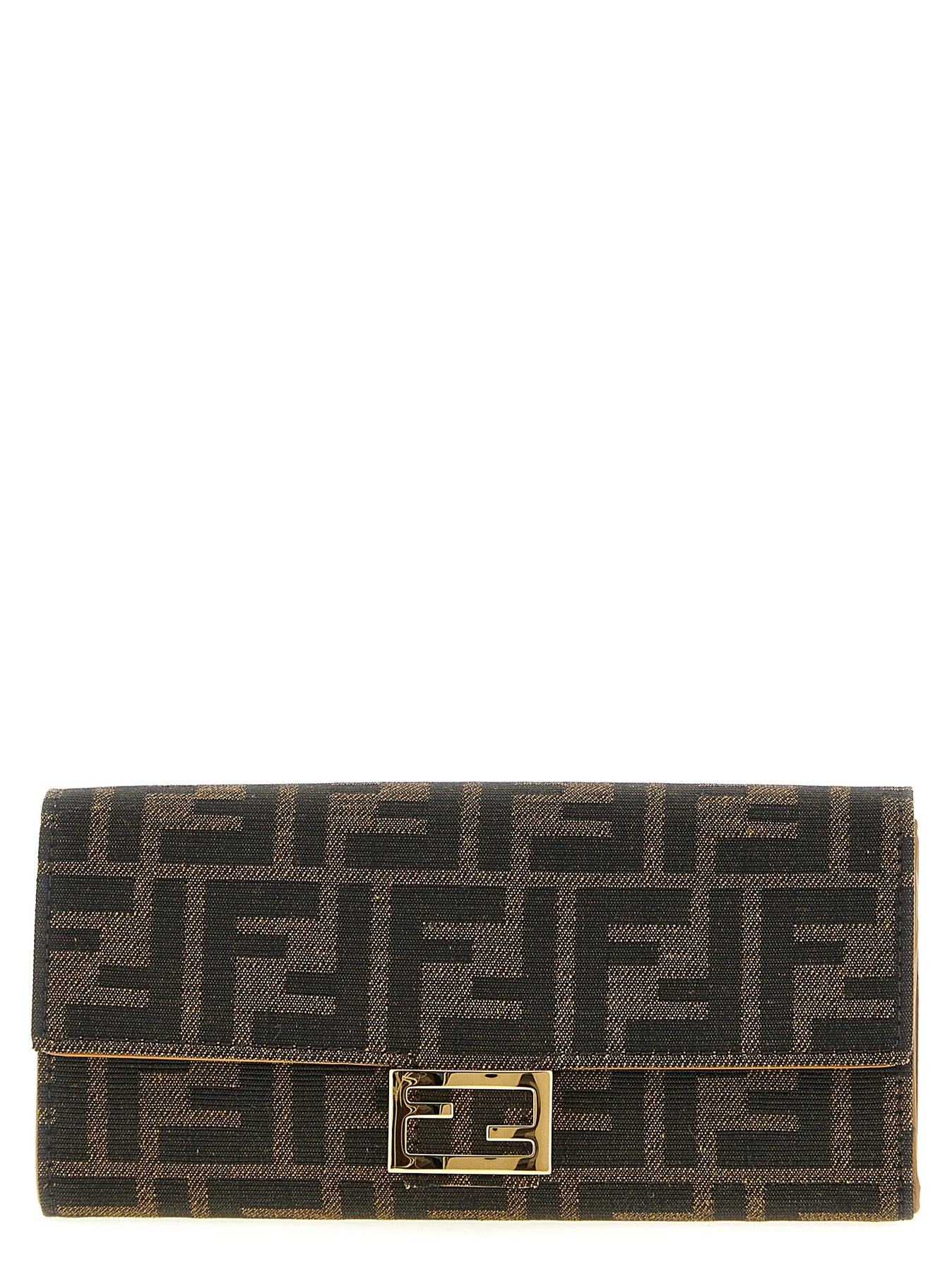 'Continental Baguette' wallet On Chain in FF jacquard fabric, leather lining, magnetic flap closure with metal logo buckle, removable chain shoulder strap.
