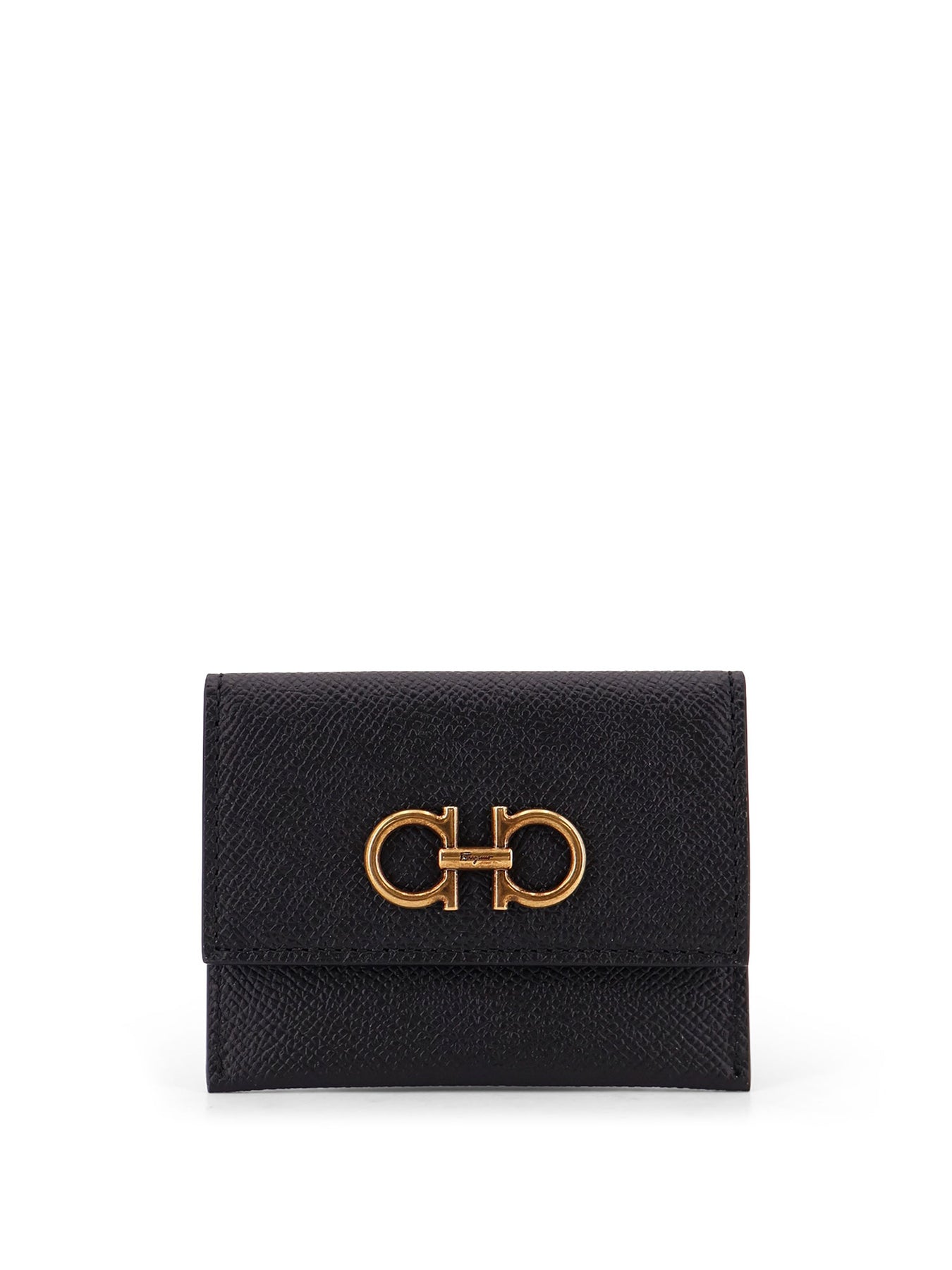 Metal Gancini logo Flap closure with snap button Three credit card slots Made in Italy Leather W: 10 cm, H: 8 cm SKU: 220861779901001