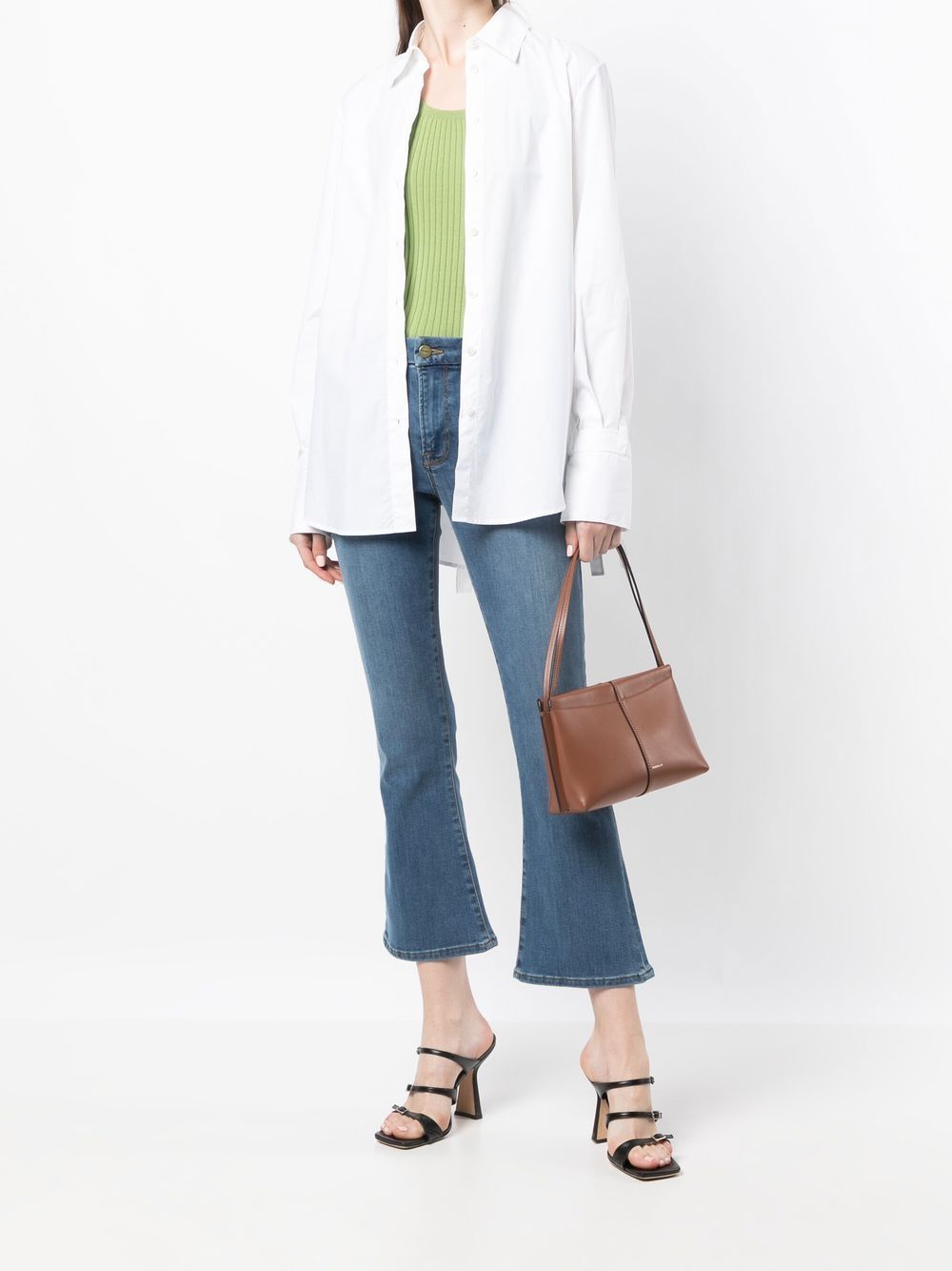 blue cotton blend dark wash belt loops front button and zip fastening classic five pockets cropped flared