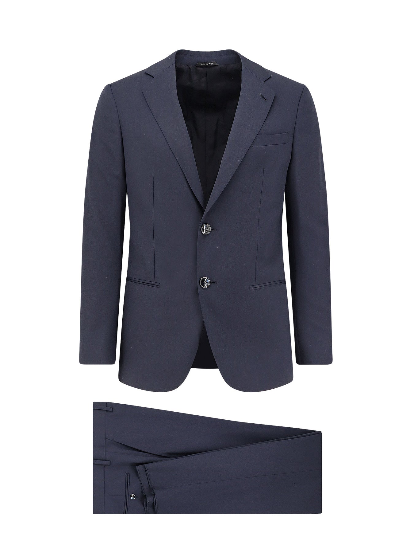 Blazer: Two-button closure with classic peak lapels Front welt pockets and one chest pocket Trousers: Button and zip closure Front slant pockets and back buttoned welt pockets Made in Italy 100% virgin wool Lining: 100% cupro SKU: GM000605TE10047UB109