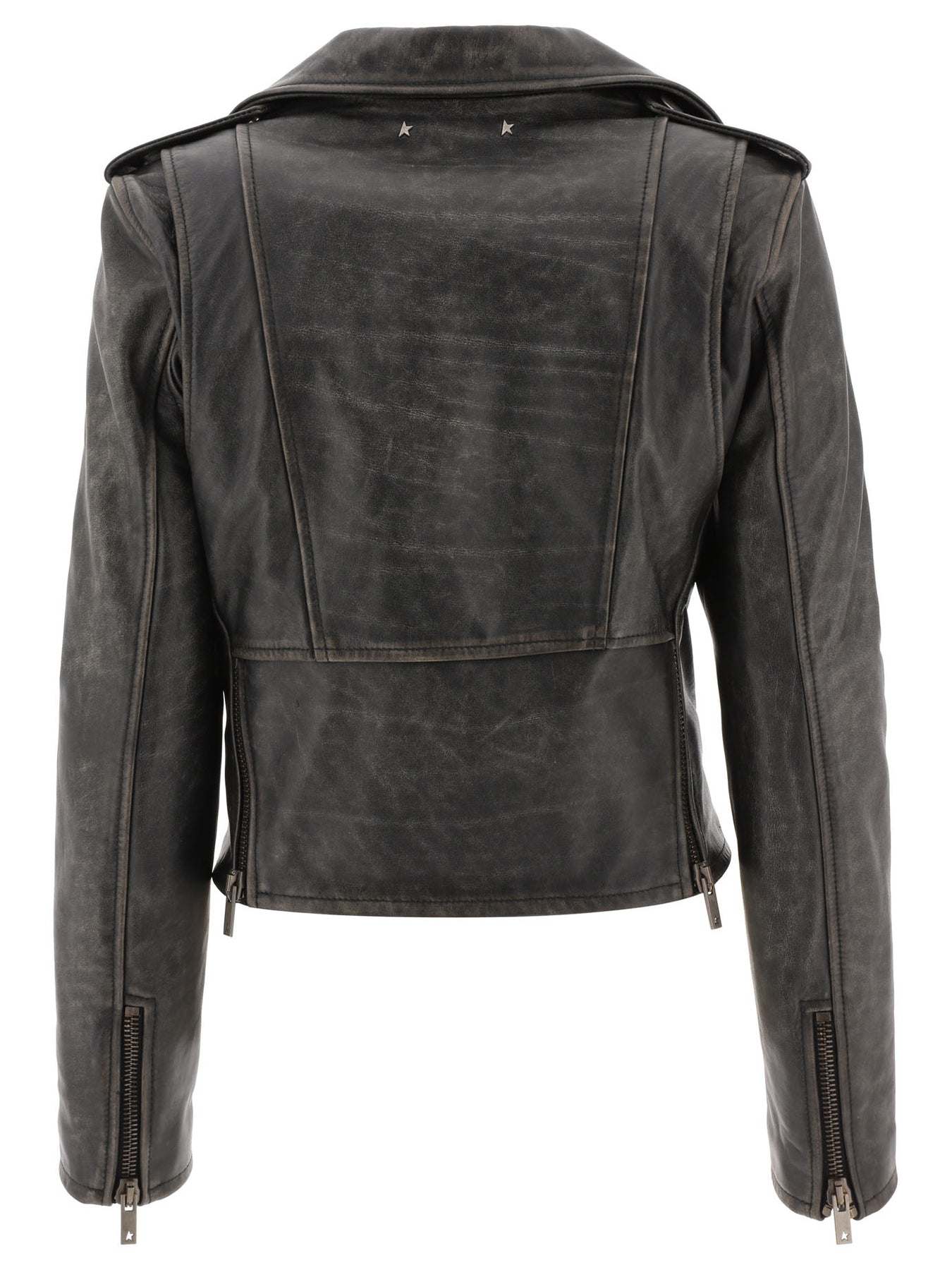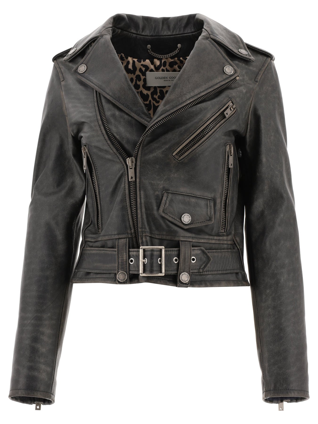 Golden Goose "Chiodo Destiny" leather jacket made of 100% cowhide with structured construction and fitted silhouette. Four front pockets integrated in the front and adjustable belt with buckle applied to the bottom. Long sleeves and central metal zipper closure. Distressed treatment on the surface gives an irregular texture. Internally, it features polyester lining with animal print. || - Lining: 100% polyester - Animal print lining - Double gold star applique on the back - Four front pockets - Belt with buckle - Zipper closure - Long sleeves - Distressed treatment - Slim fit