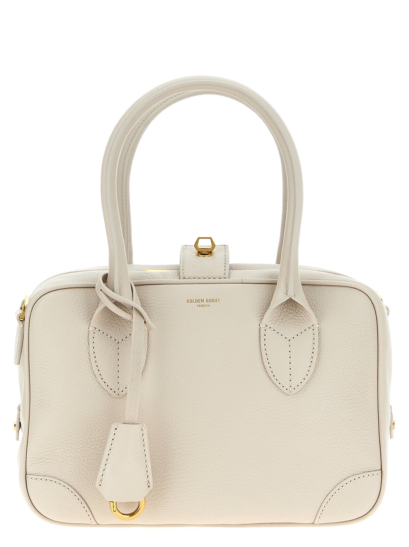 'Vita' leather handbag with zip and band closure with metal spin, double handle, removable keyring, adjustable and removable shoulder strap.