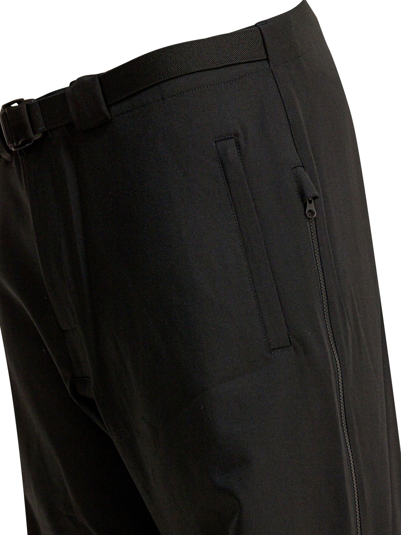 Gr10K wool-blend belted pants with straight silhouette and defined structure. Model constructed from a blend fabric composed of wool, polyester and elastane, features an integrated adjustable belt with buckle closure, zippered side pockets and functional details. Seams follow essential lines, ensuring durability and stable shape in everyday wear. Metal elements are visible at adjustment and closure points. || - Solid color - Medium waist - Integrated belt with buckle - Side pockets with zippers - Regular fit