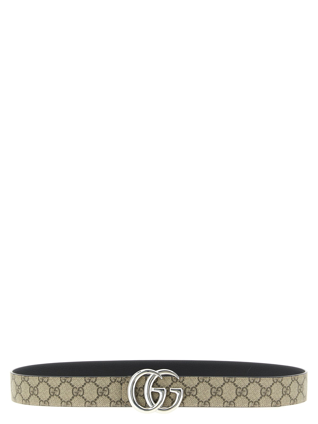'GG Marmont' reversible belt in plain smooth leather and fabric covered with GG monogram and metal Double G buckle.