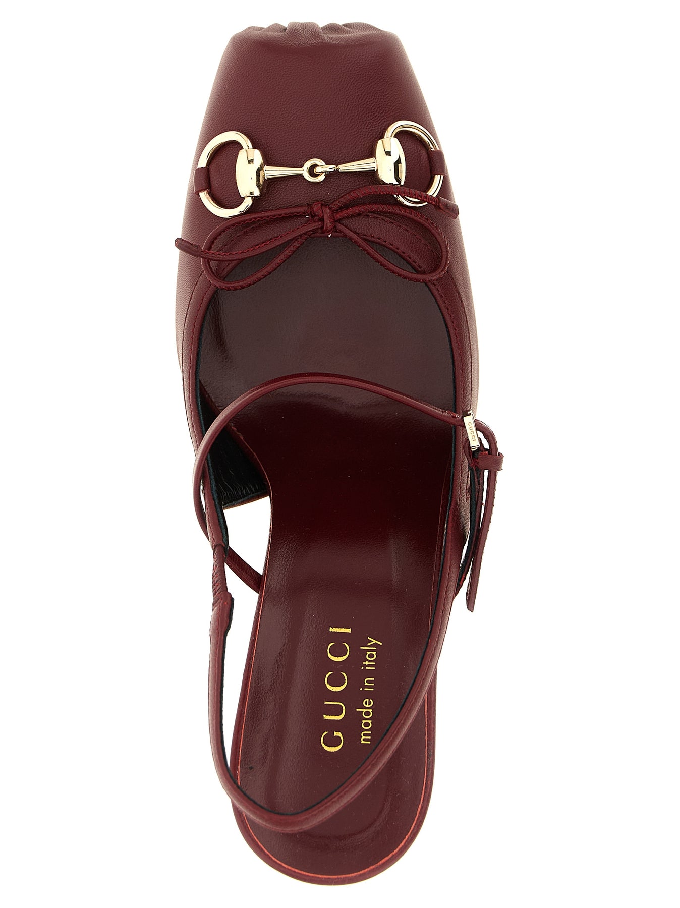'Gucci' leather 'Gucci Rosso Ancora' slingbacks, bag structure with squared closed toe, metal clamp detail and tone-on-tone bow on the front, adjustable strap on the instep, back elastic strap, big heel, leather sole.