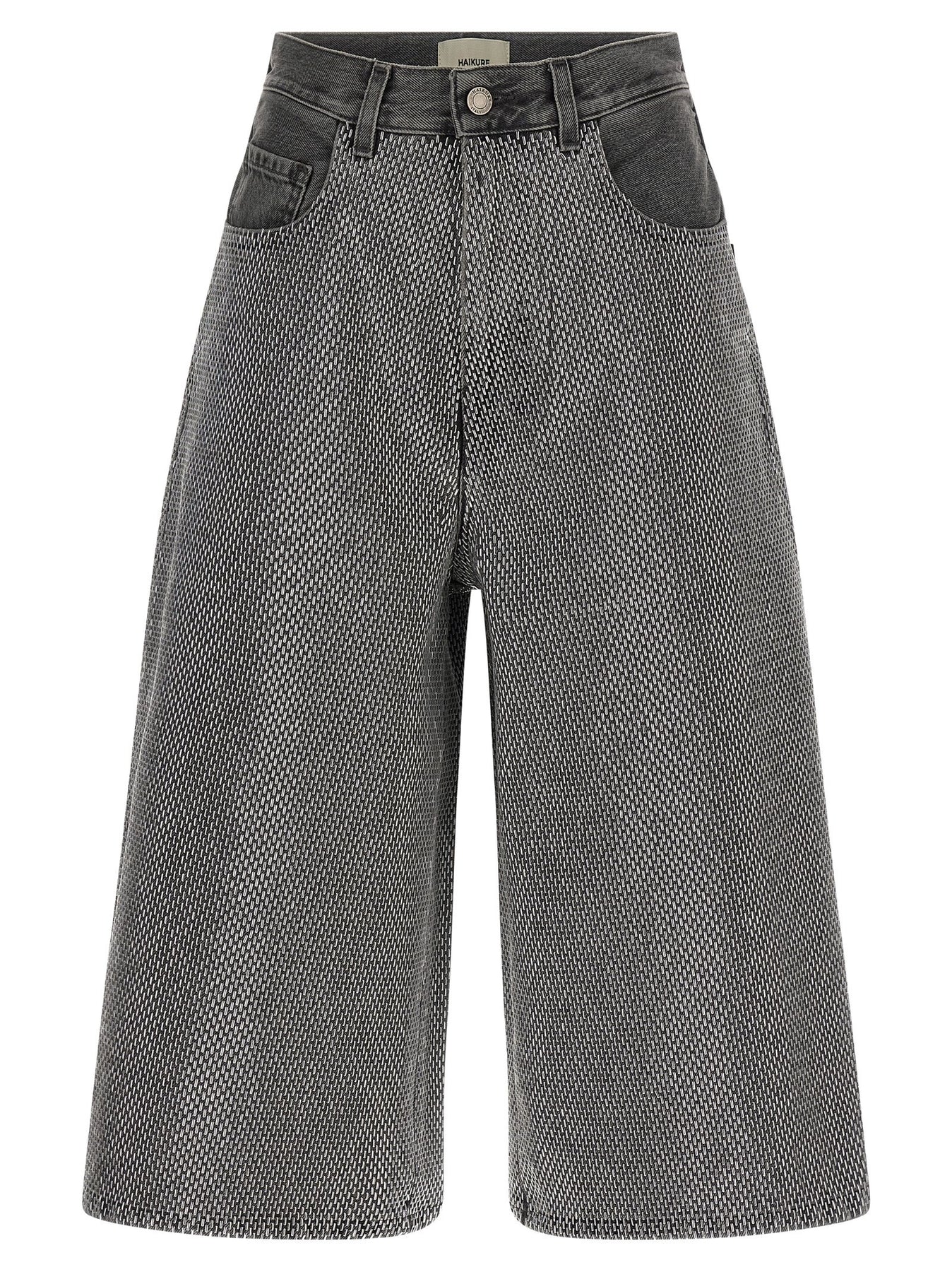'Belle' cotton denim bermuda shorts with all-over baguette studs, wide leg, front zip and button closure, five pockets, back suede logo tag.