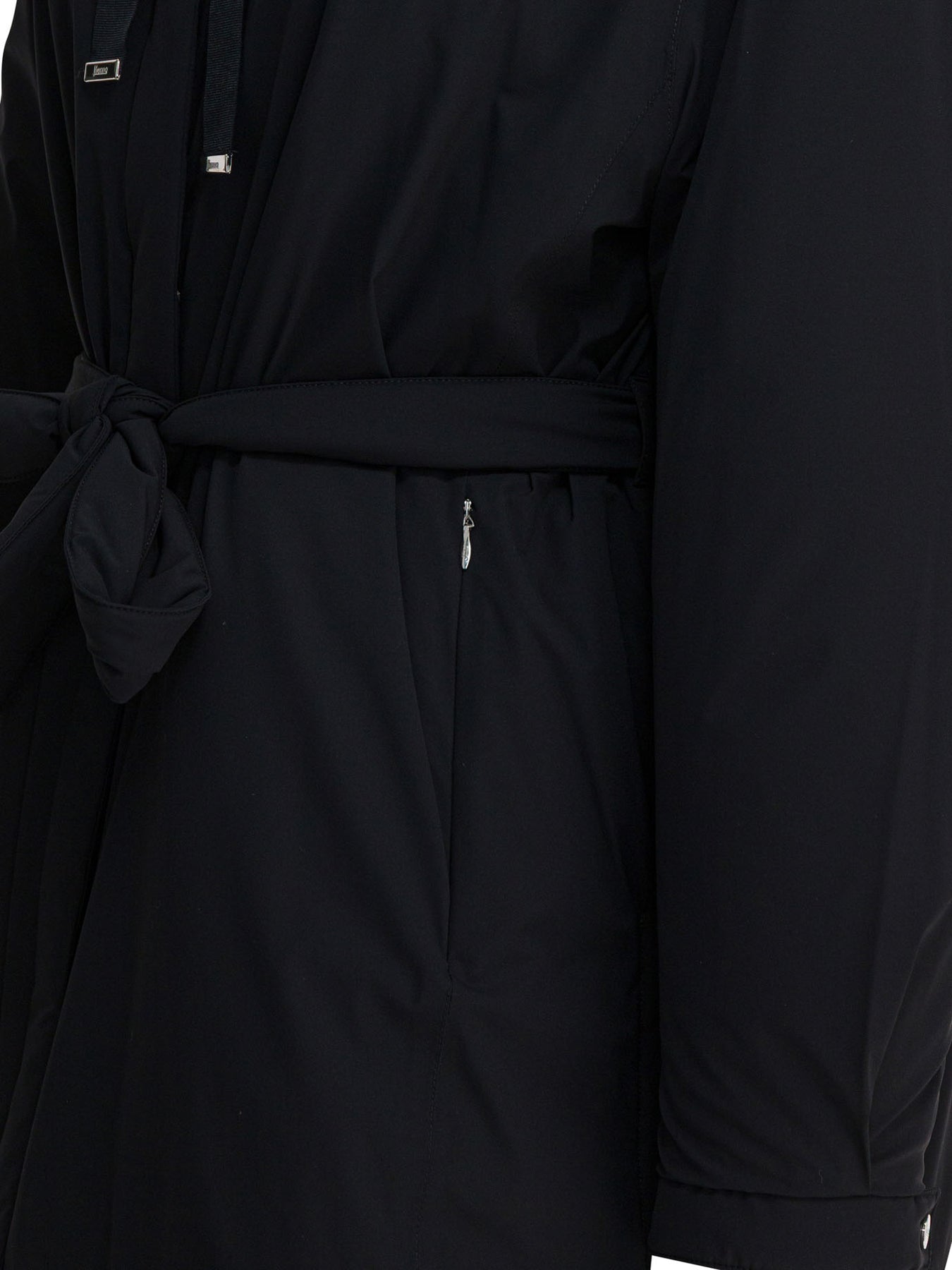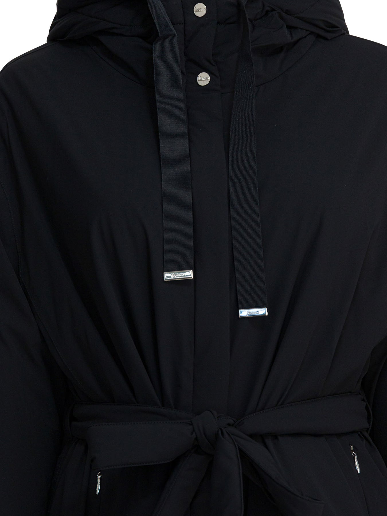 Herno nylon hooded jacket made from technical fabric composed of a predominant percentage of nylon and a component of elastane to increase the performance of the structure. The silhouette is straight with a mid-length. It features a fixed hood, long sleeve and front zipper closure combined with snap hooks. The waistband highlights the waistline. Welt pockets built into the hips complete the functional construction. || - Solid color - Fixed hood - Zipper closure with snap hooks - Waist belt - Welt pockets - Regular fit