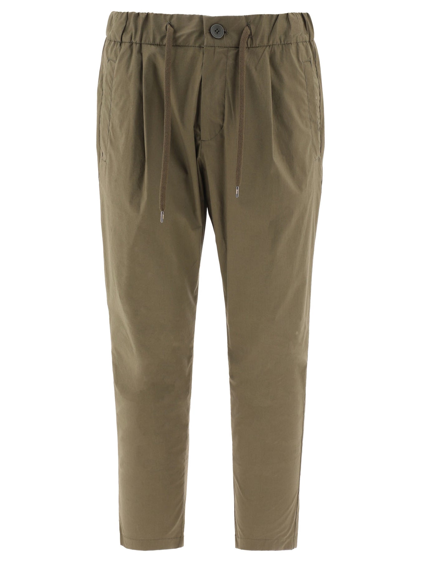 Herno cotton stretch pants made with cotton-elastane blend construction. They feature a slim silhouette with a straight-cut leg, shaped to provide softness at the top and fitted structure along the leg. The waist is enhanced with adjustable drawstrings and front closure via concealed zipper and button. Integrated back pockets complete the functional and minimalist design. || - Solid color - Low waist - Hidden zipper and button closure - Drawstrings to adjust the waist - Soft at the top - Back pockets - Regular fit