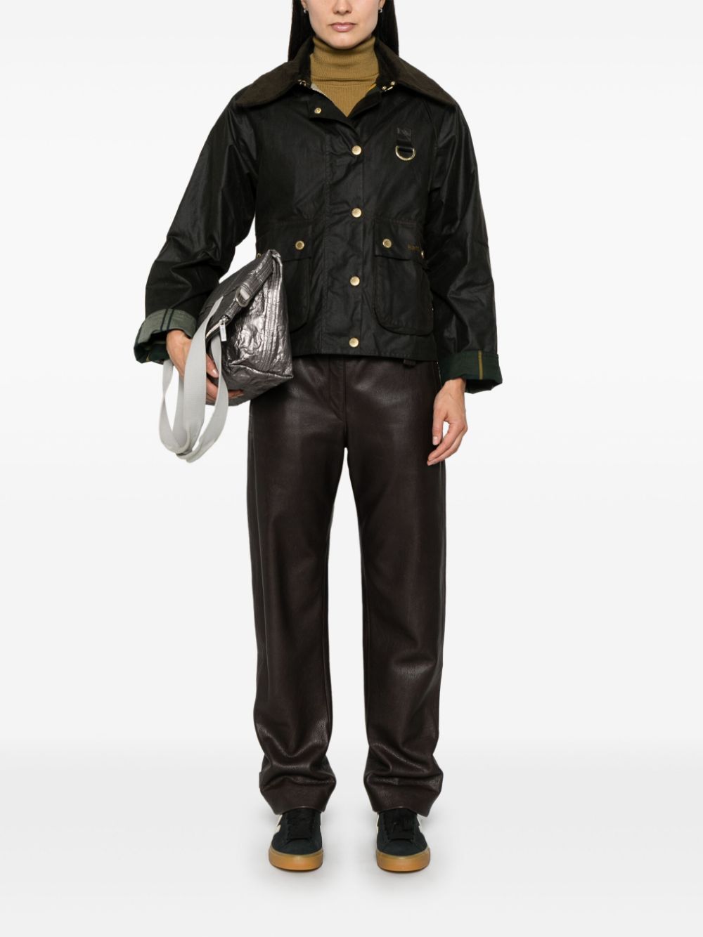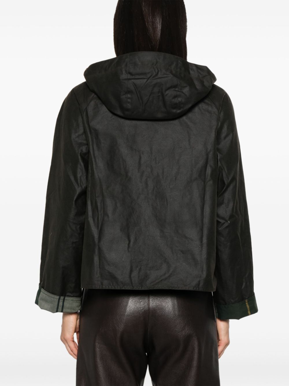 brown/green wax coated front press-stud and zip fastening corduroy collar detachable hood long raglan sleeves turn-up cuffs D-ring tab at the chest two front flap pockets embroidered logo to the front checked lining straight hem
