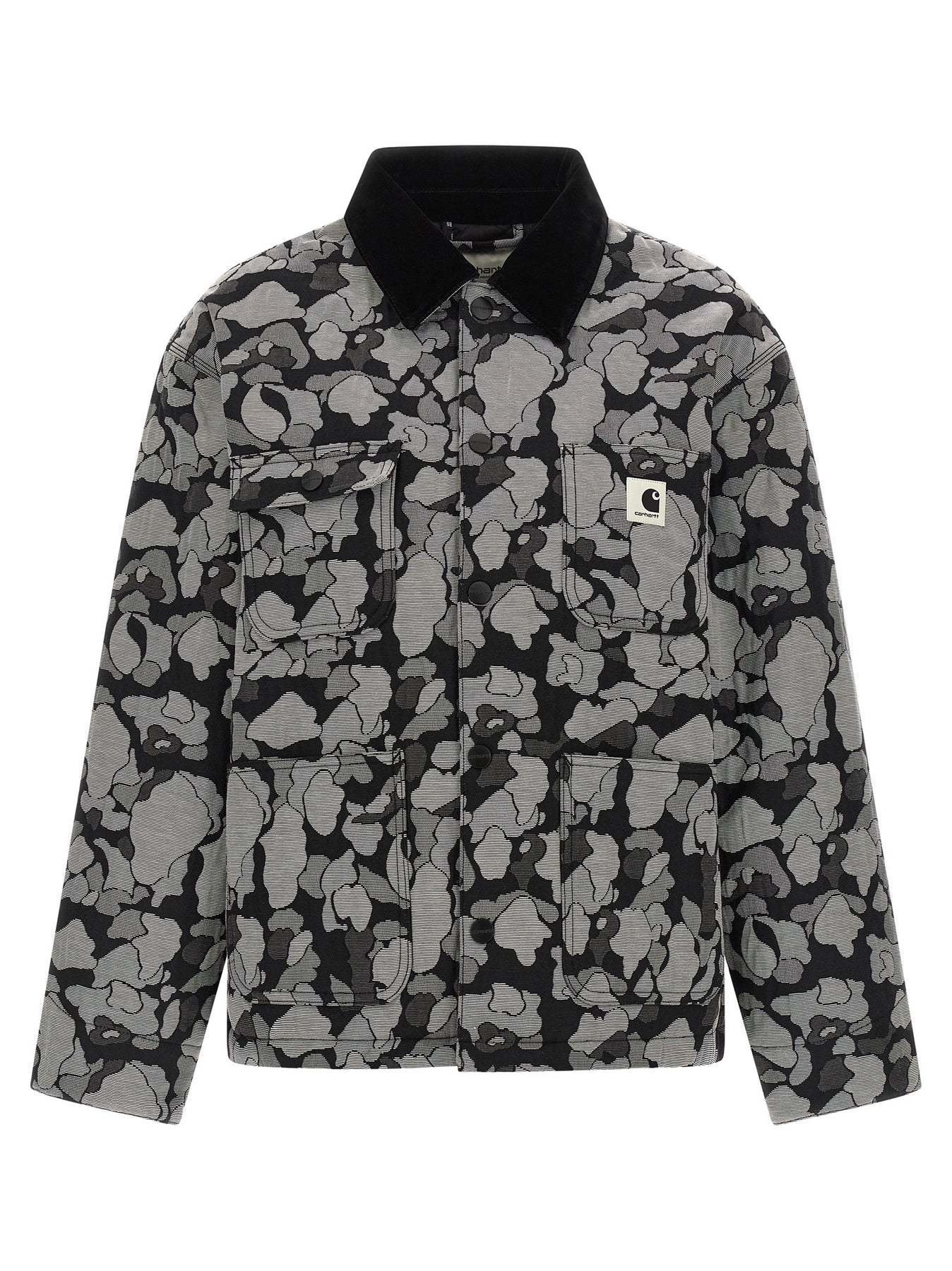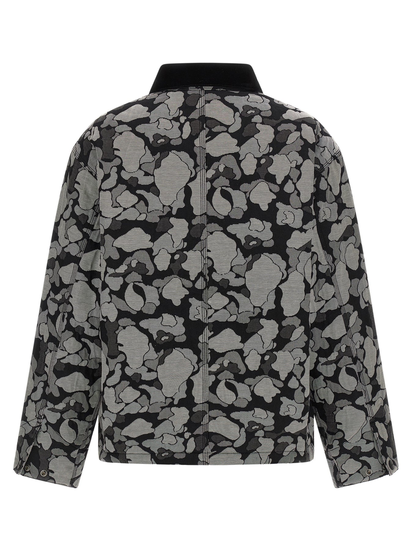 'Tapestry Chore Coat' floral jacquard jacket in velvet jacquard, velvet shirt collar, padded and quilted, front pockets, snap buttons, long sleeves with adjustable cuffs with snap buttons.
