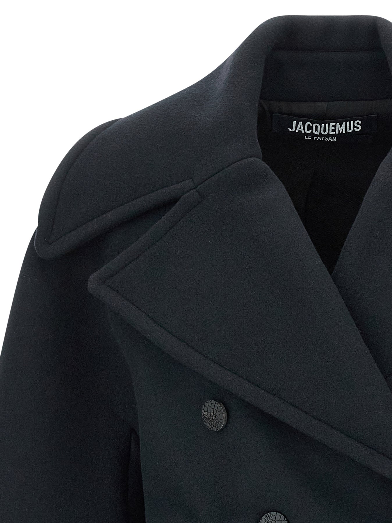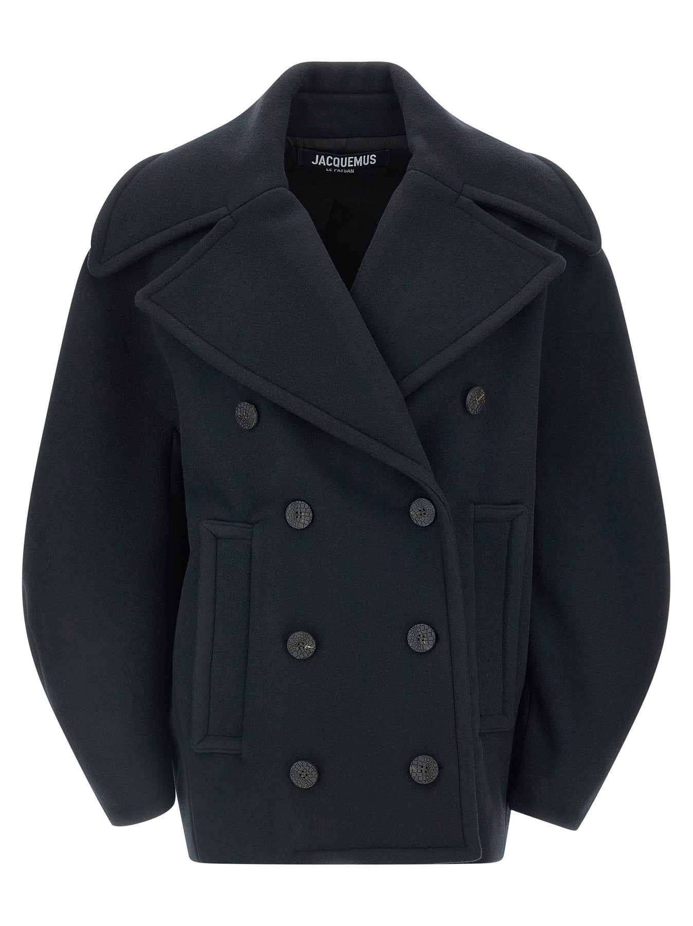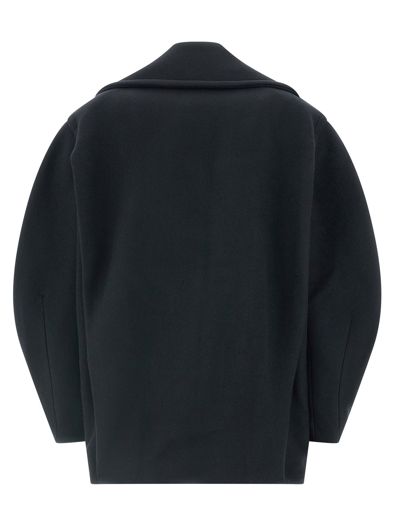 Le Caban Ovalo' virgin wool coat with viscose and cotton blend lining, double-breasted style with front button closure, round top cut, pockets, long curved sleeves with dropped shoulders, back gussets.