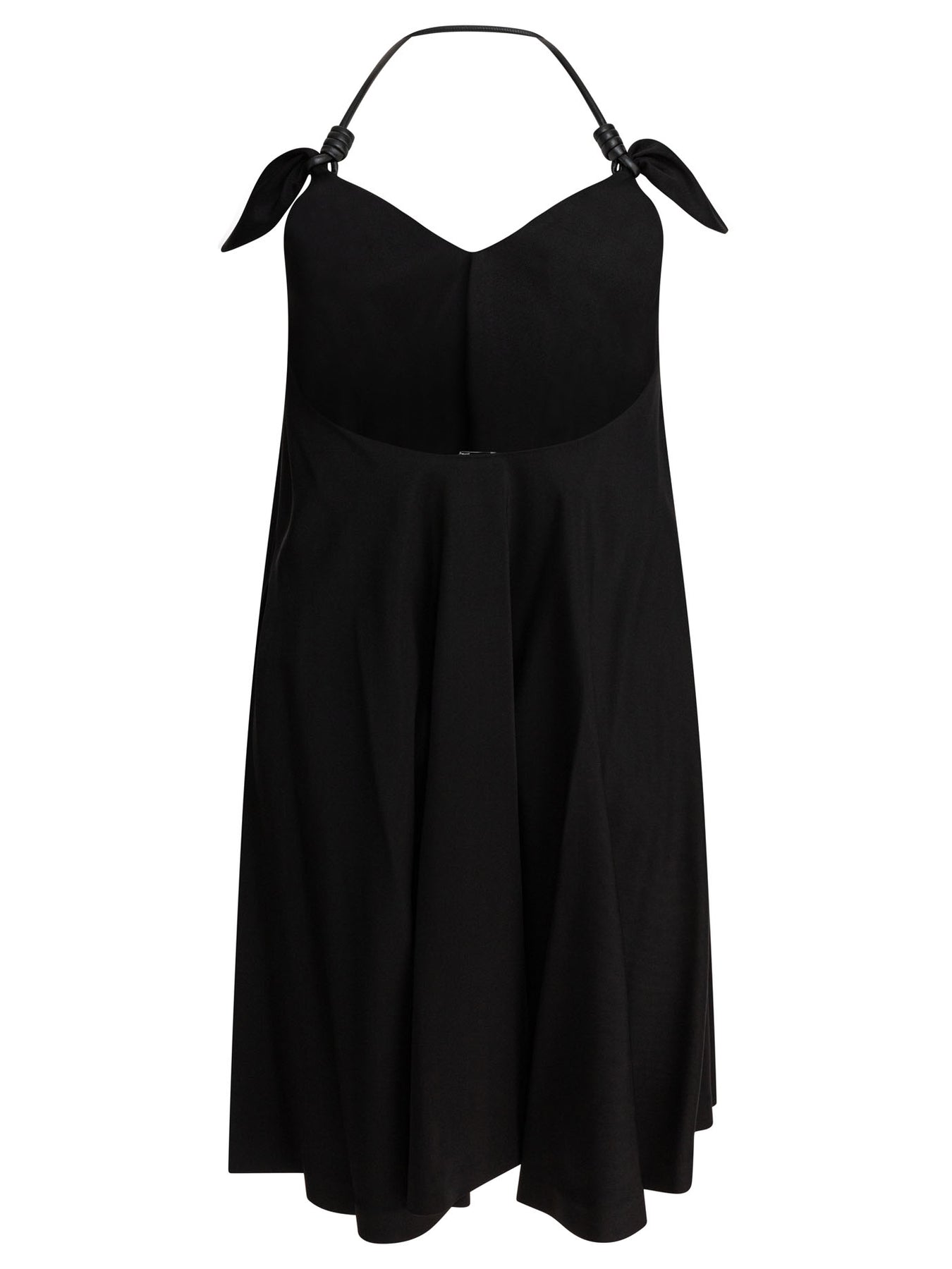 Loewe "Flamenco" dress made of medium-weight stretch viscose cady. The silhouette features an American neckline, open back, and opening at the back. The construction includes flamenco-inspired knots applied near the shoulder straps. Fully lined model with regular fit, detailed with in-seam pockets and front V-neckline. Material offers structural stretch and a defined fit. || - Solid color - Open back dress - Sleeveless - V-neckline - American neckline - Back opening - Flamenco-inspired decorative knots - Inseam pockets - Fully lined pattern - Medium weight - Regular fit