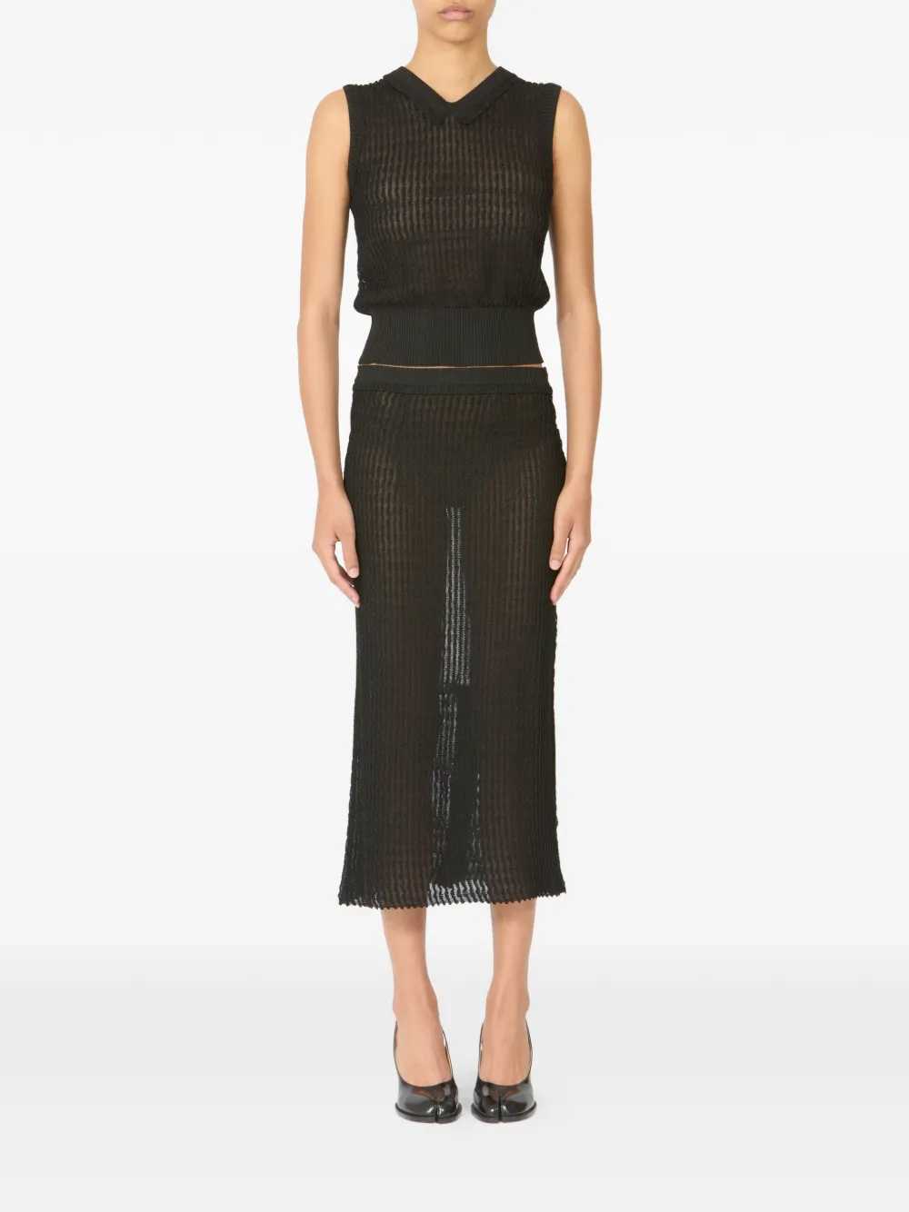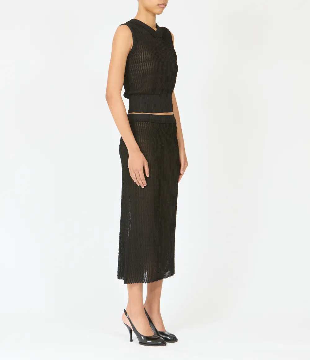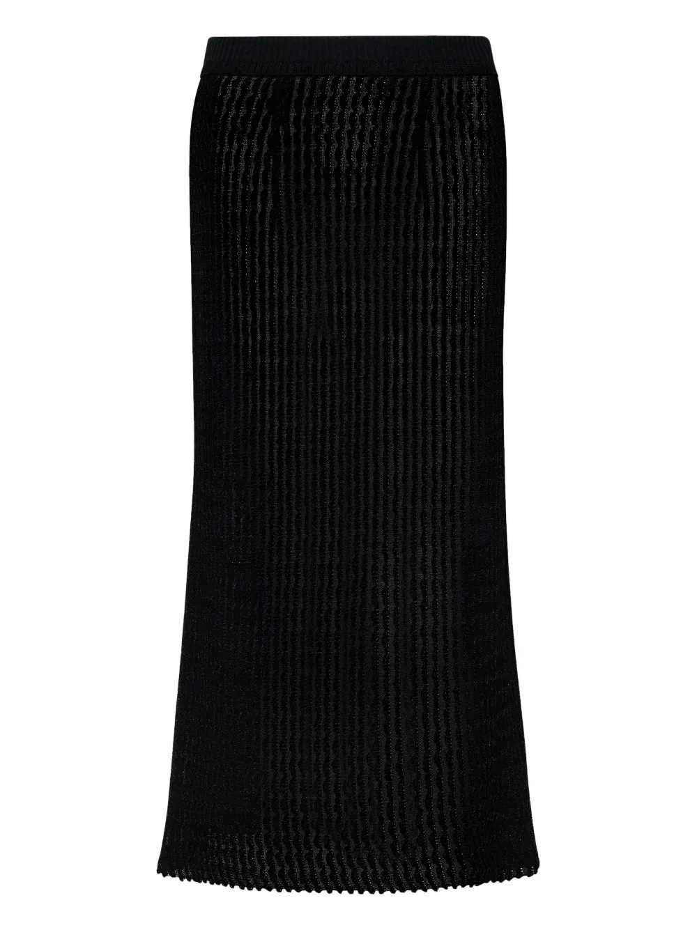Ribbed knit midi skirt Origin: Italy Features Black Ribbed knit Elastic waist Composition 59% polyester, 41% viscose Washing Instructions Read the manufacturer`s instructions ID S51ME0060M13240