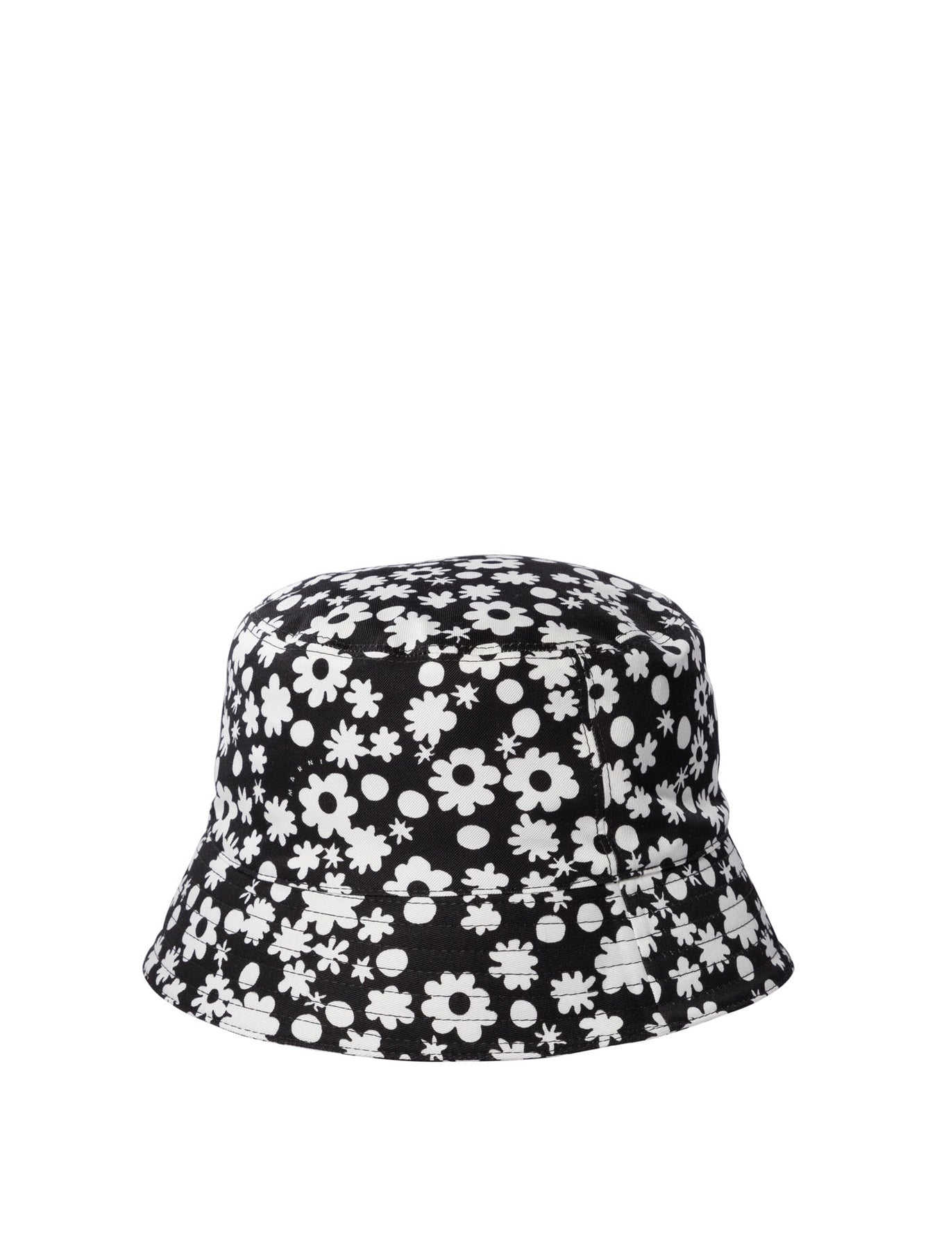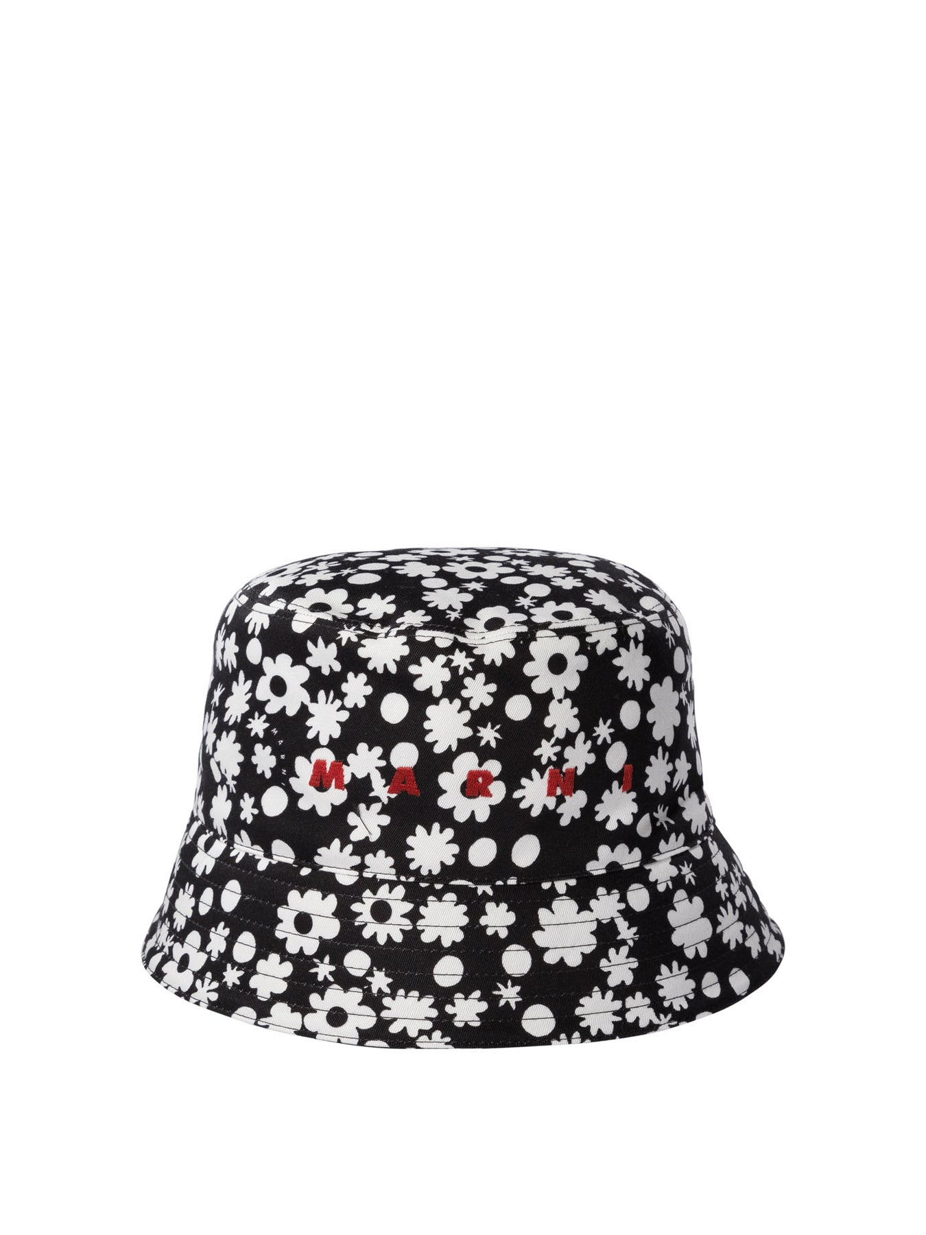 Marni cotton bucket hat with soft texture and round silhouette. The construction includes a flat crown that keeps the shape, while the brim is narrow and low. The surface is entirely covered with a uniform floral print. A front logo embroidery finishes the hat, integrating a distinctive element on the front. The main material is cotton. || - Cotton - All-over floral print - Flat crown - Front logo embroidery - Narrow, low brim