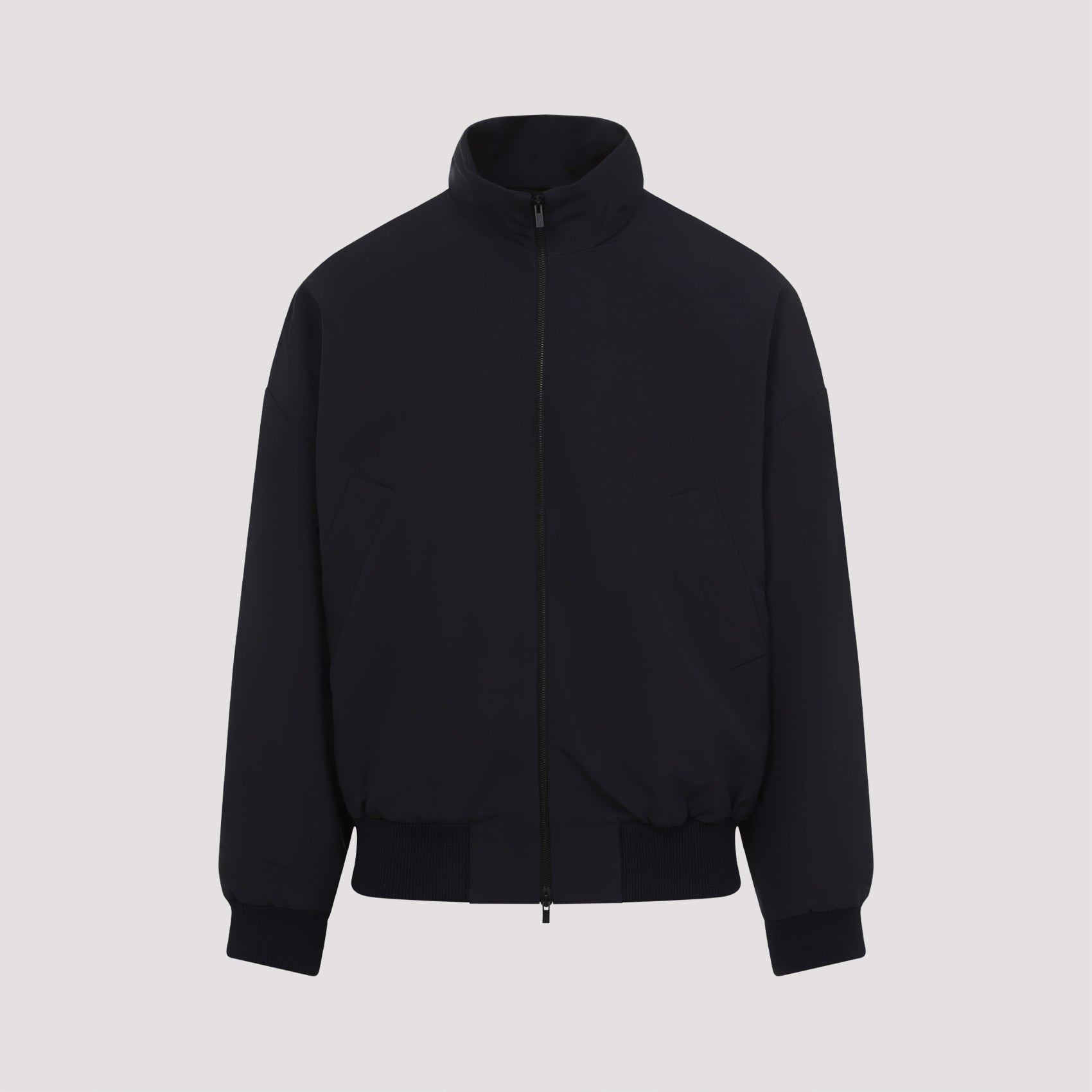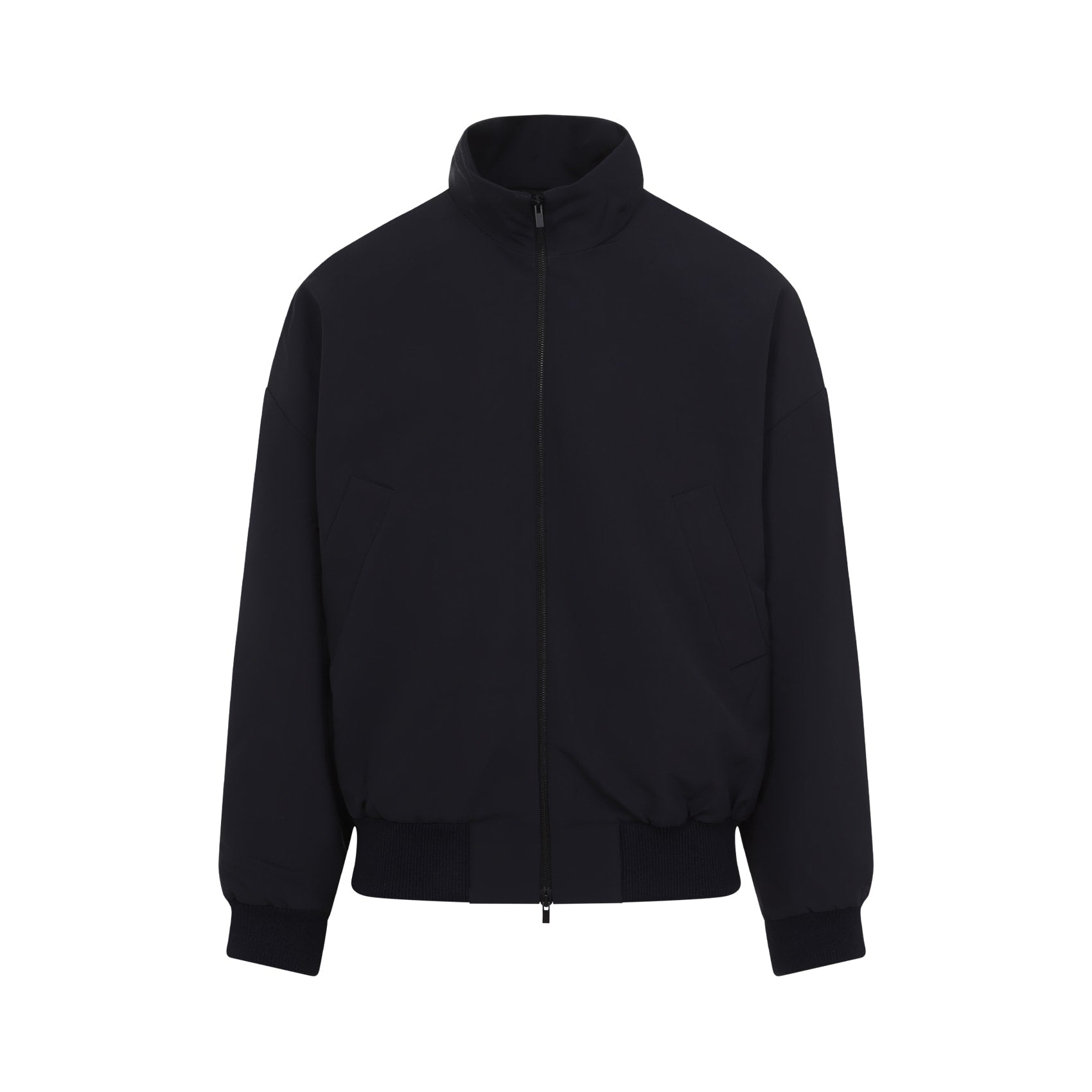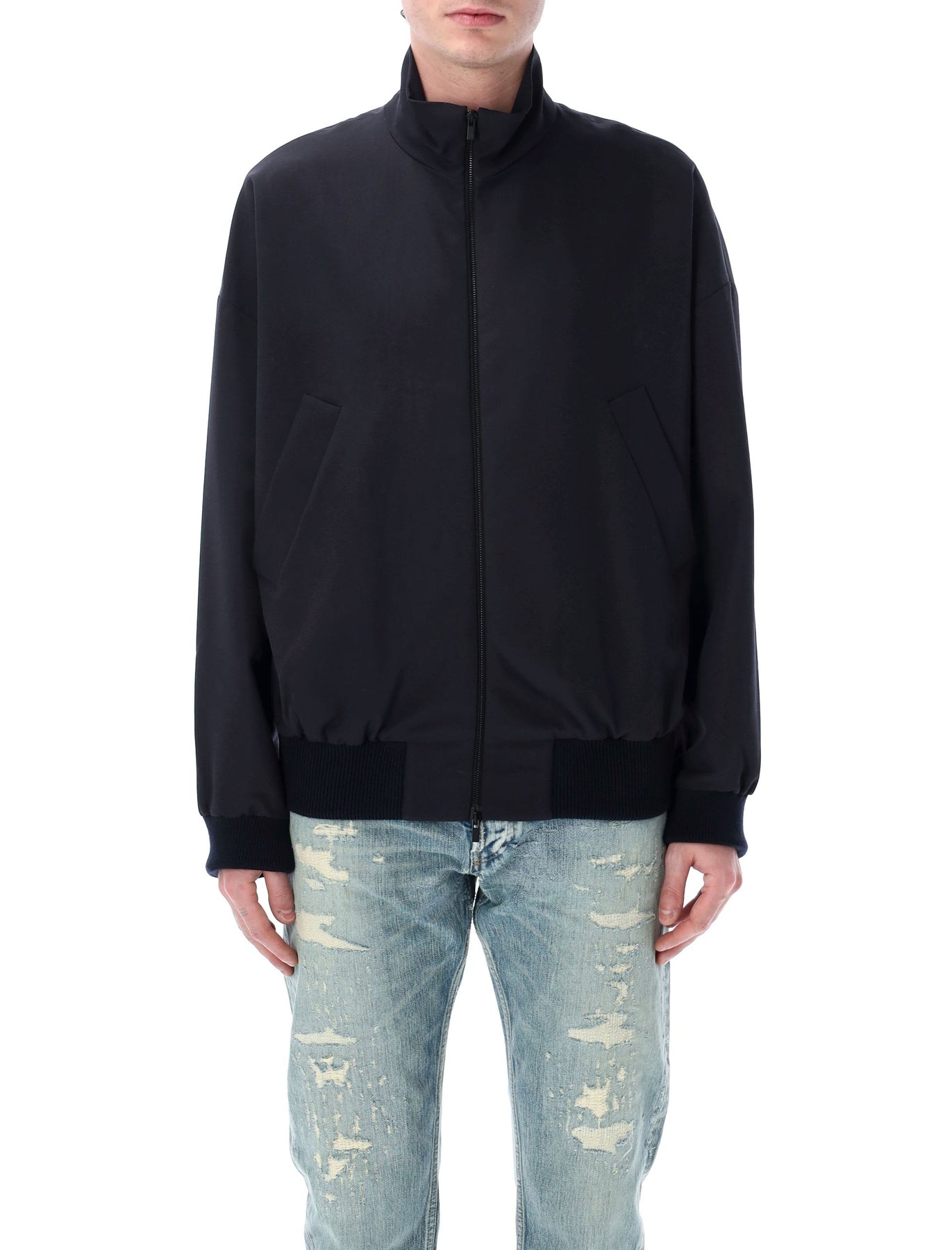 High neck track jacket by Fear Of God in virgin wool featuring front zipper closure, elasticated cuffs and rib-knit waist hem