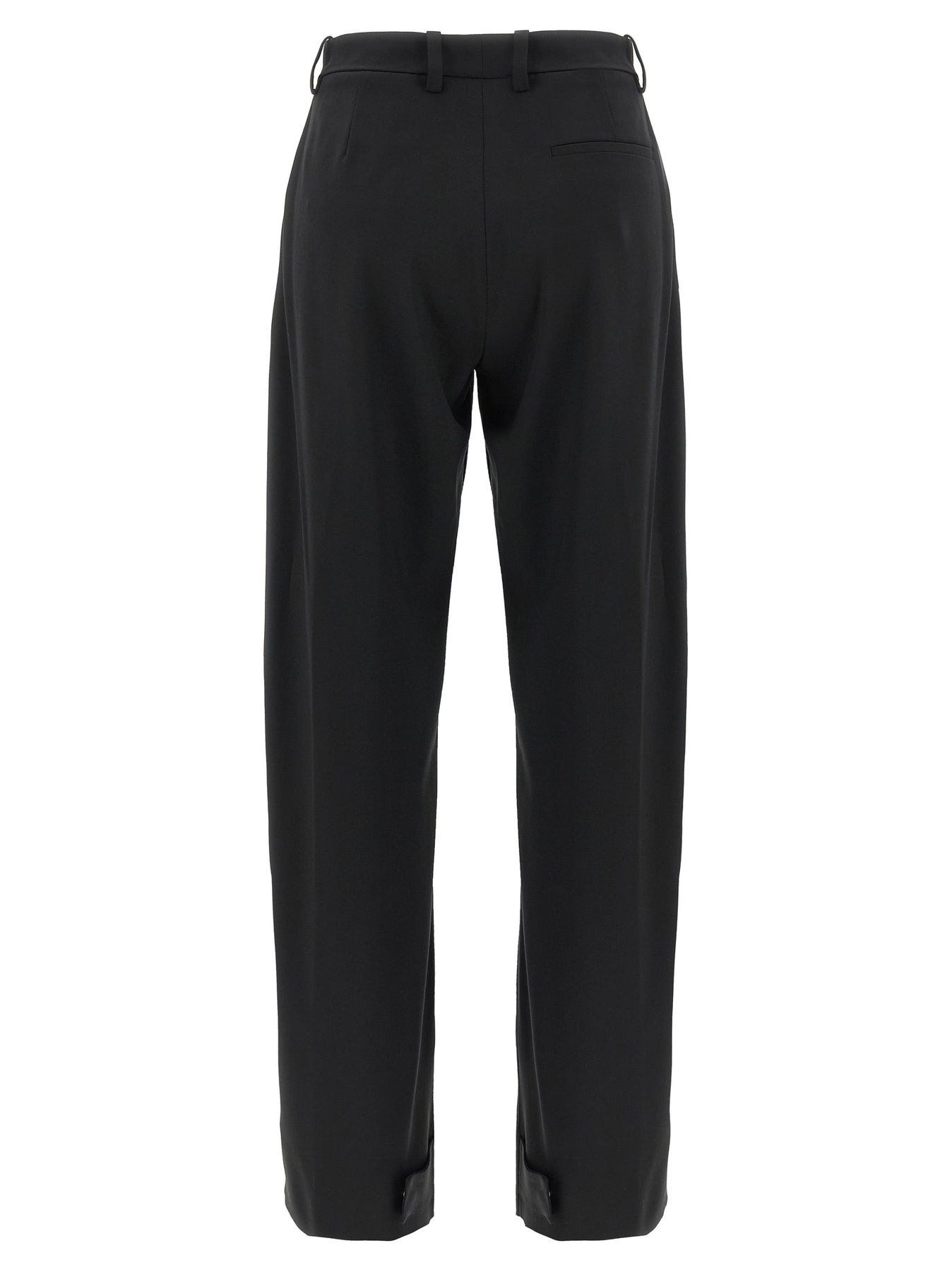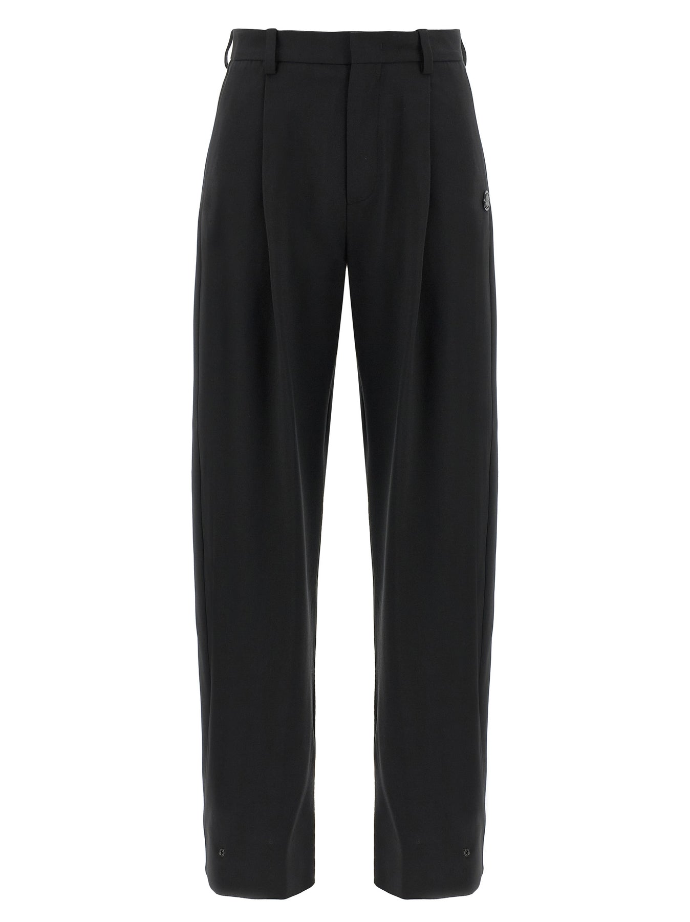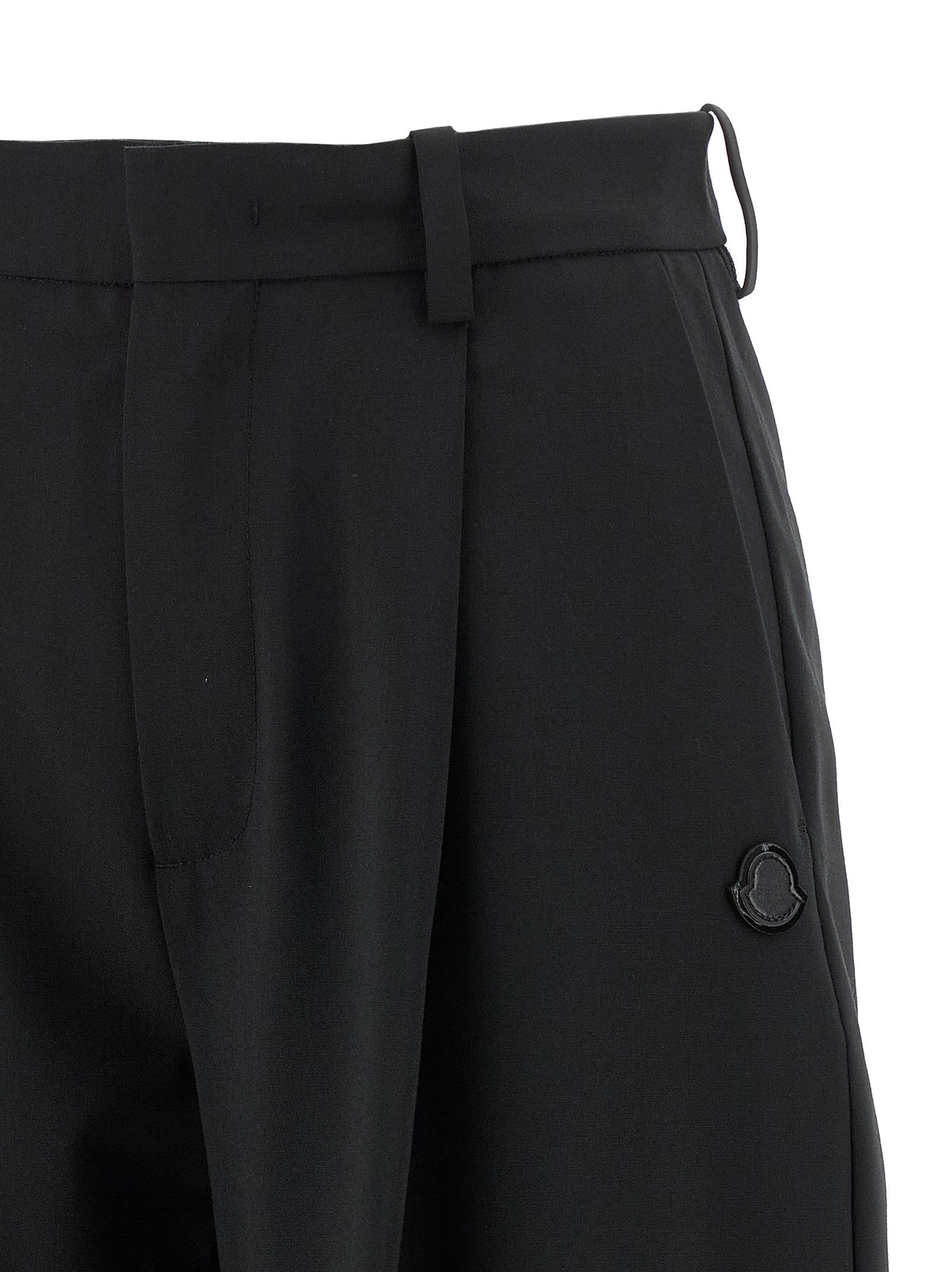 Moncler x Edward Enninful wool blend trousers, tone-on-tone logo patch and zip hook and front button closure, pockets, pince, stretched pleat, adjustable strap with snap button on the leg bottom.