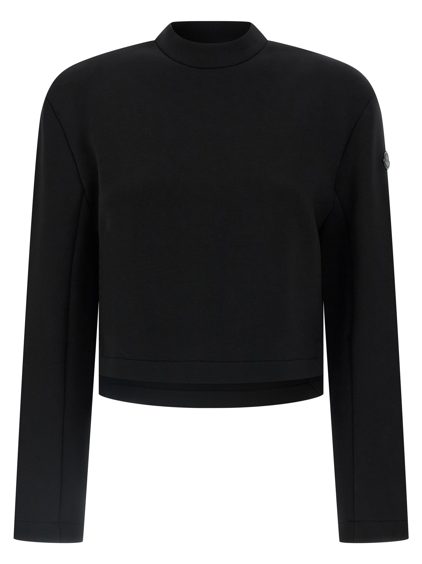 Moncler x Edward Enninful sweatshirt in scuba-effect fabric, crop model, high neck, long sleeves with cuffs and tone-on-tone logo patch applied, side slits, and asymmetrical hem.