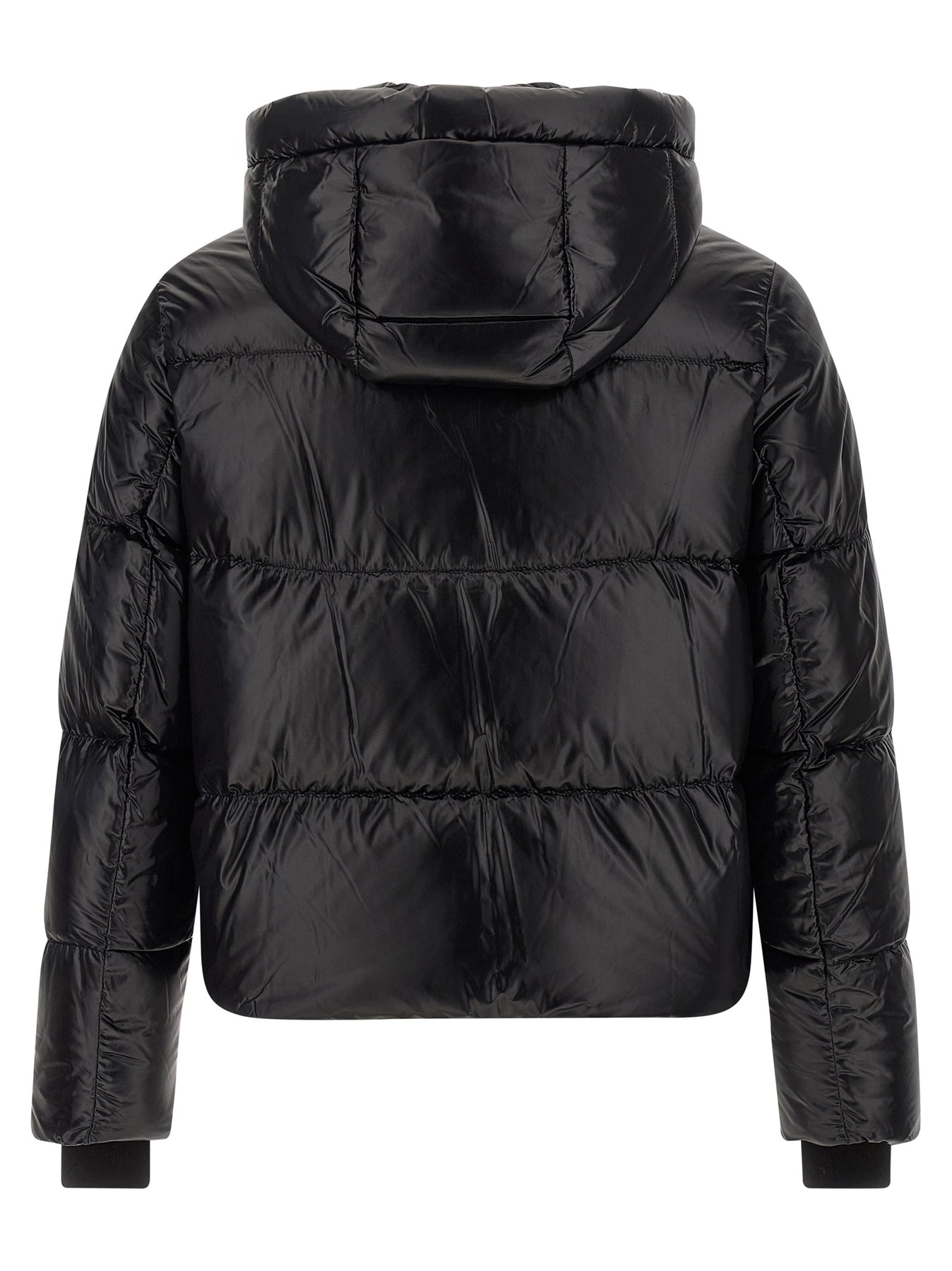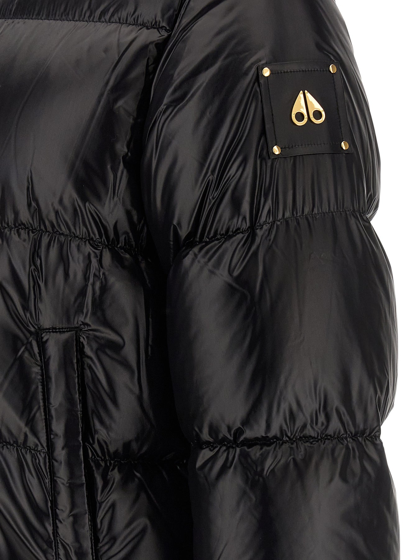 'Moonstone' glossy quilted nylon down jacket with goose down padding, adjustable and removable hood, standing collar, front zip closure, pockets, long sleeves with knitted cuffs and metal patch appliqué, drawstring at the hem.