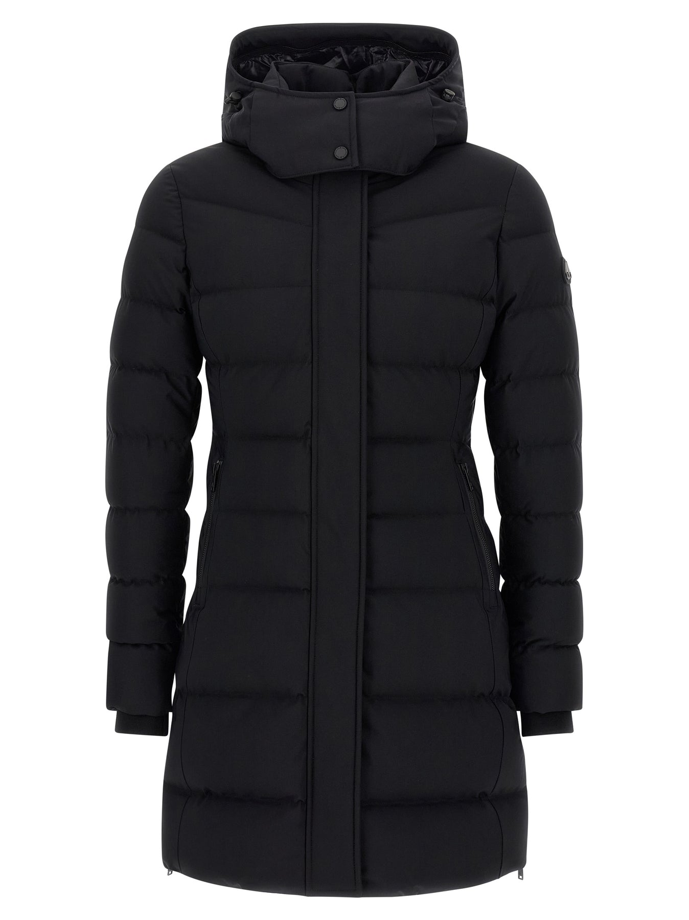 Padded and quilted 'Watershed 3 Parka' jacket, removable hood with zip for finishing change, high neck, front hooded closure, side logo patch, knee length with side zip slits, long sleeves with zip on the bottom and knitted cuffs.