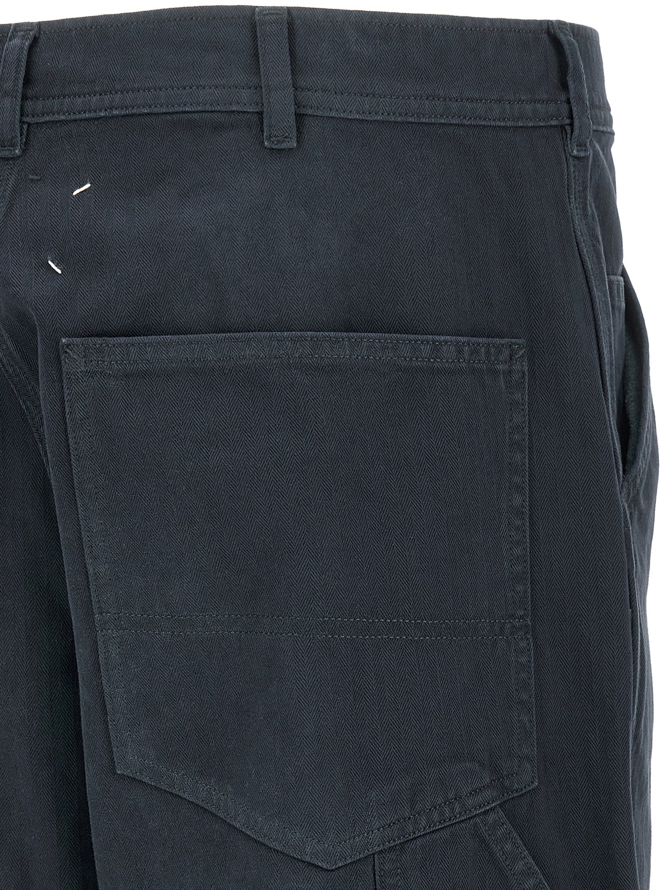 Workwear pants in herringbone cotton canvas, wide and straight leg, front zip and button closure, five pockets, leg bottoms with raw cut hem and trompe l'oeil turn-up crease, 'Four stitches' at the back.
