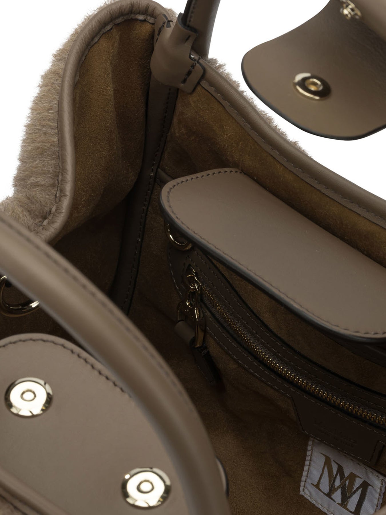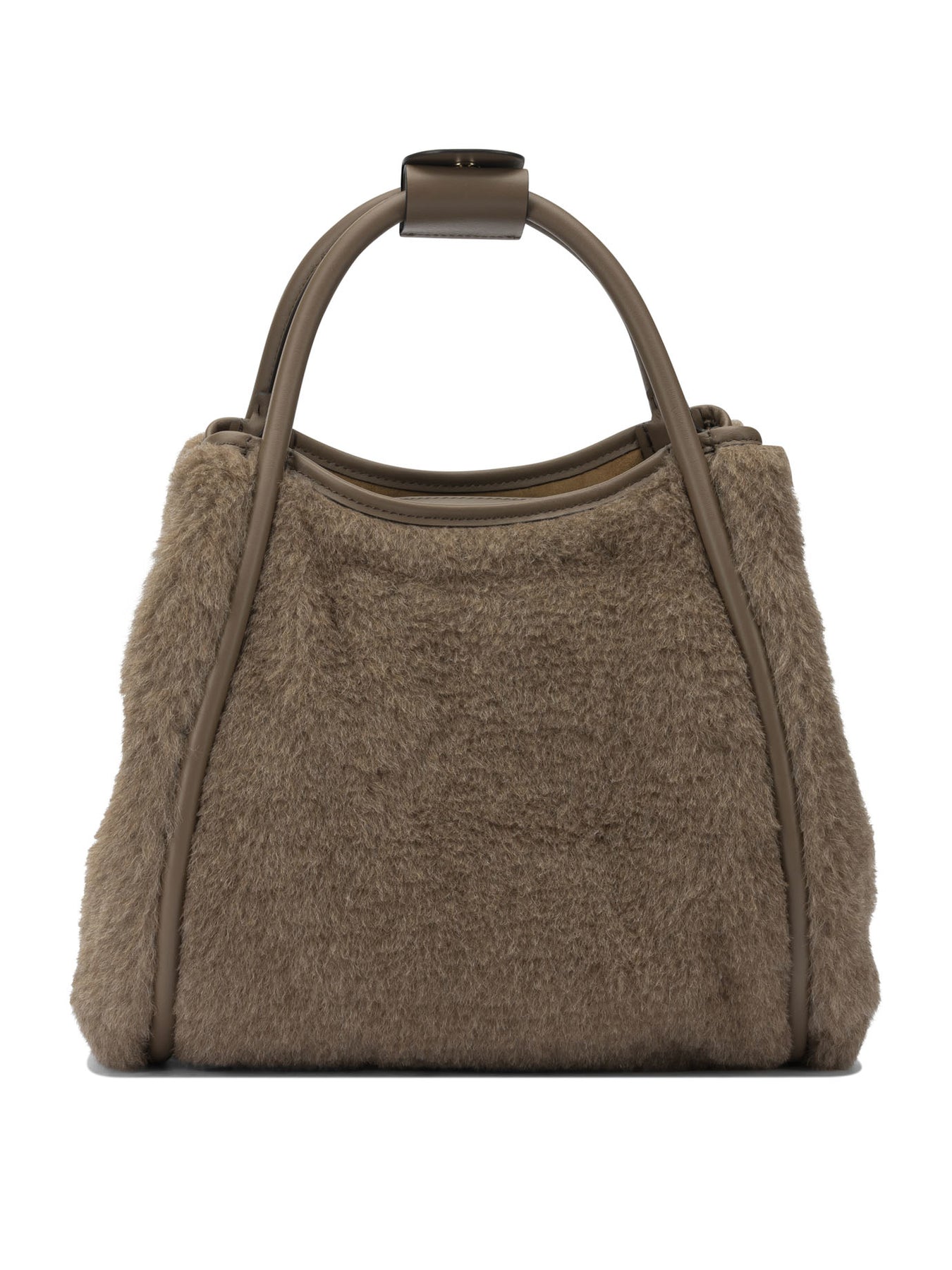 Max Mara wool "Marine" handbag made of Teddy fabric composed of alpaca, cashmere and silk. The structure features fold-over sides that modify the silhouette profile, tubular handles with loop and an adjustable and removable shoulder strap. The softly textured interior includes zippered pocket and custom open pocket. The construction is complemented by Cameluxe padding and smooth leather details. || - Folding sides for shape variation - Internal loop for attaching small leather goods - Cameluxe recycled material padding - Tubular handles and removable adjustable shoulder strap - Dual interior pockets: one zippered, one custom open - Max Mara letters applied on the front - Five metal feet on the bottom - Top magnet closure