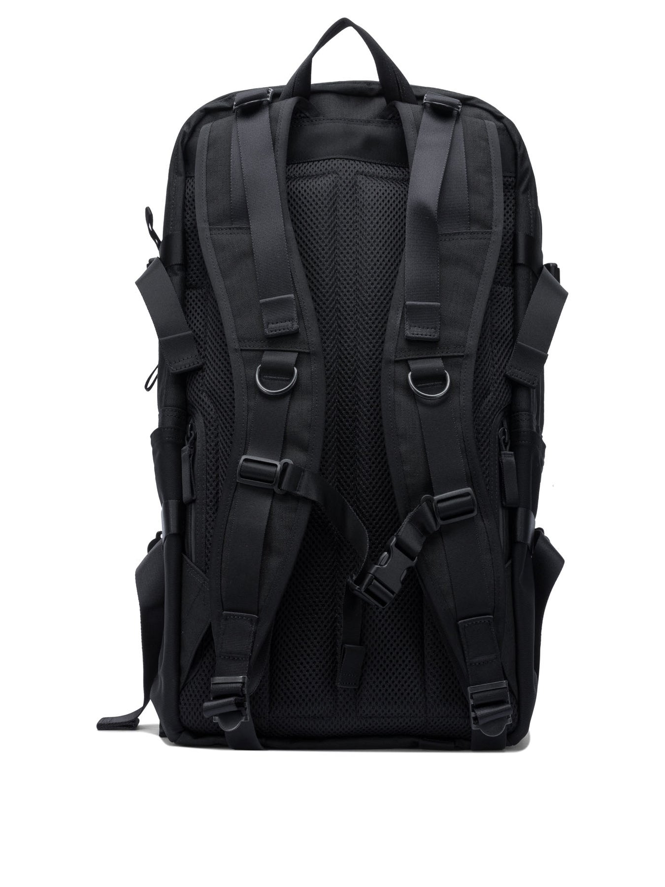 Porter-Yoshida & Co. "Hybrid Dayback" Backpack. The structure is developed on a compact, rigid silhouette made of original X-C1000 fabric that combines 1000-denier cordura nylon interwoven with X-PLY polyester in diagonal arrangement. The insertion of a polyester PET film, obtained by patented lamination, seals the weave and provides waterproofing. The gusset uses X-PLY derived from the same X-C1000, giving textural uniformity. || - X-C1000 fabric, developed in collaboration with Dimension-Polyant and Invista - Cordura nylon structure woven with X-PLY polyester for improved strength and lightness - Laminated with polyester PET film for waterproof protection