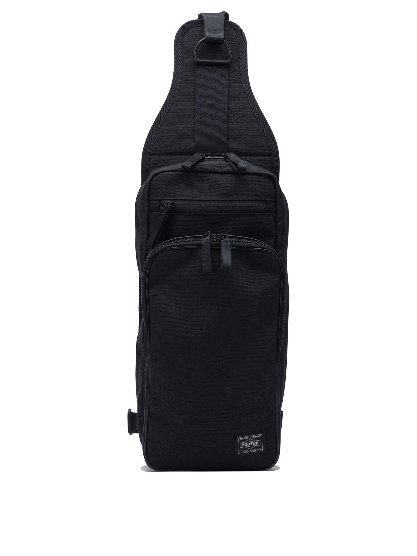 Porter-Yoshida & Co "Hybrid Sling" one-shoulder backpack constructed from X-C1000 fabric developed in collaboration with Dimension-Polyant and Invista. The structure uses 1000-denier cordura nylon woven with X-PLY polyester in a diagonal orientation, optimizing strength and flexibility. The silhouette is compact and contoured, with reinforced seams and panels laminated through a thin PET film to provide waterproofing and protection from the elements. || - X-C1000 main fabric composed of 1000-denier cordura nylon and laminated X-PLY polyester - PET film construction for waterproofing - Structured shape with reinforced panels and gussets - Lightweight and resistant to tears and wear and tear - Top zippered closure and adjustable shoulder strap