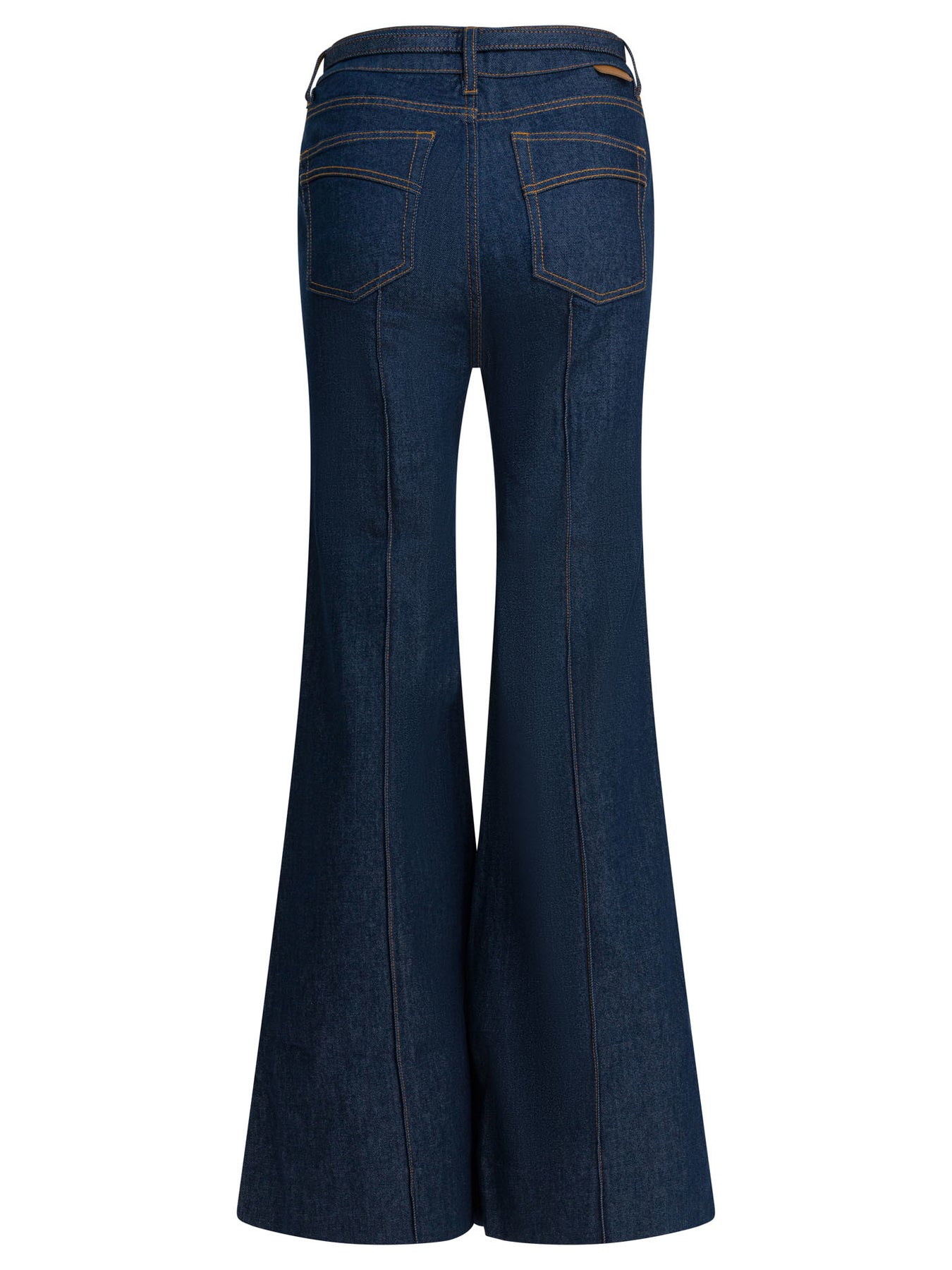 Zimmermann wide-leg jeans made of softly structured denim feature a wide straight silhouette from waist to hem. A coordinating belt in identical fabric runs through the belt loops, adjusting the fit in front. Construction features contrast stitching and flat topstitching along the main lines. Inserted side pockets follow the horizontal cut, with back featuring patch pockets. || - Denim - Mid-rise waist - Belt in matching fabric - Front and back pockets - Contrasting visible seams - Regular fit