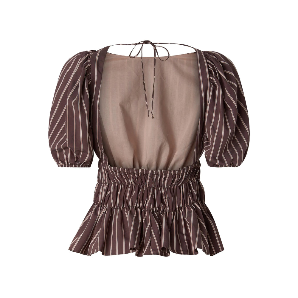 brown striped pattern ruched detail open back tie fastening puff sleeves