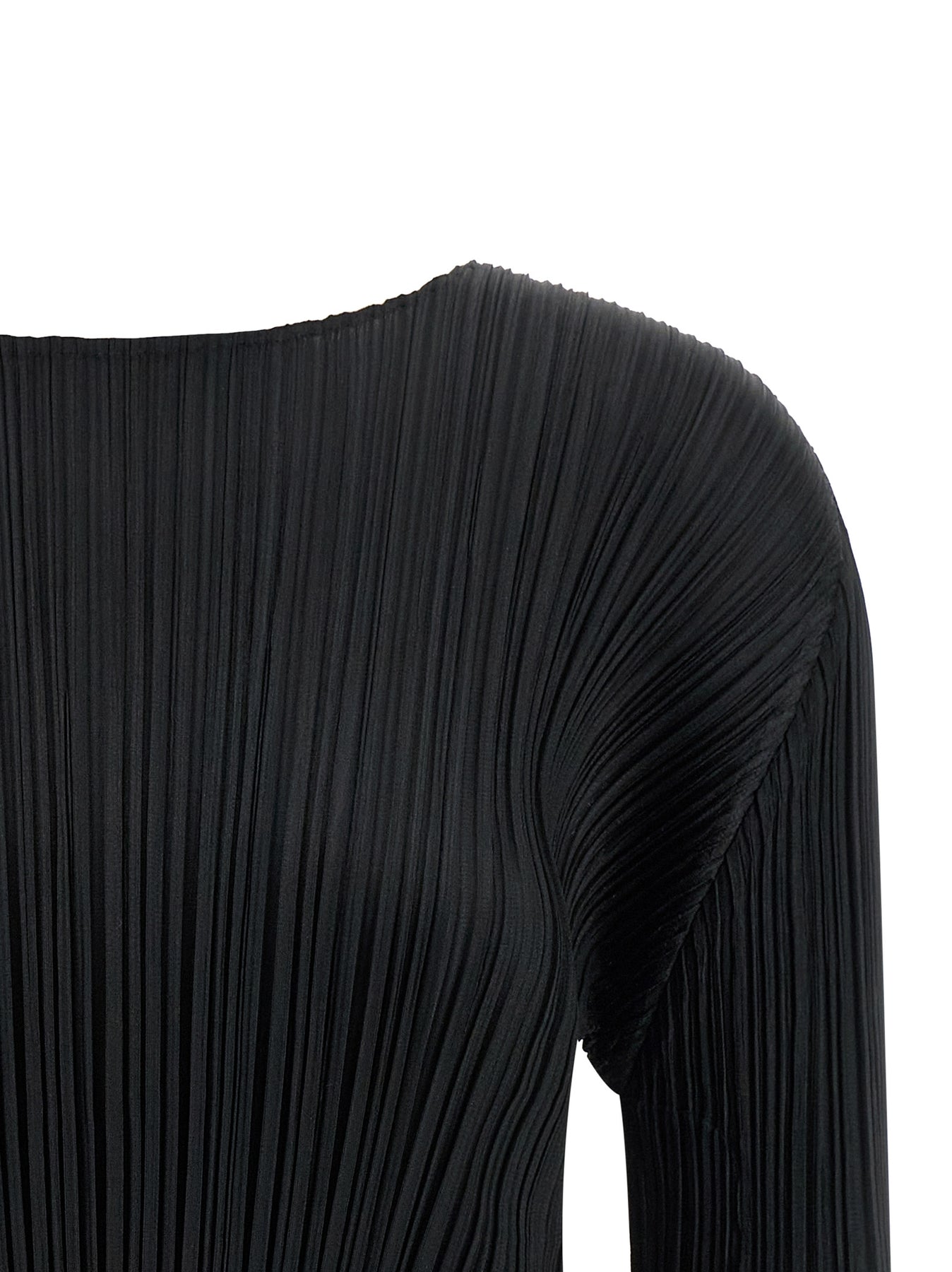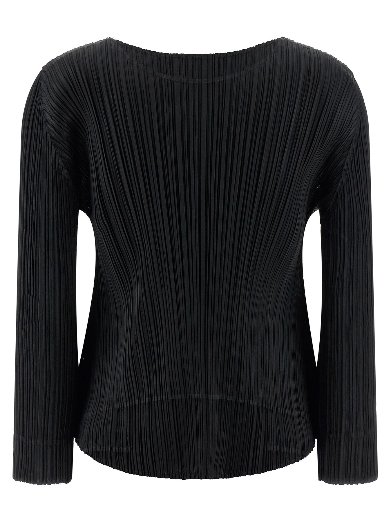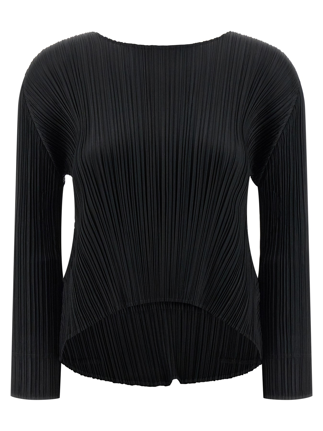 'Monthly Colors: October' pleated blouse, crew neck, asymmetric length, long sleeves.