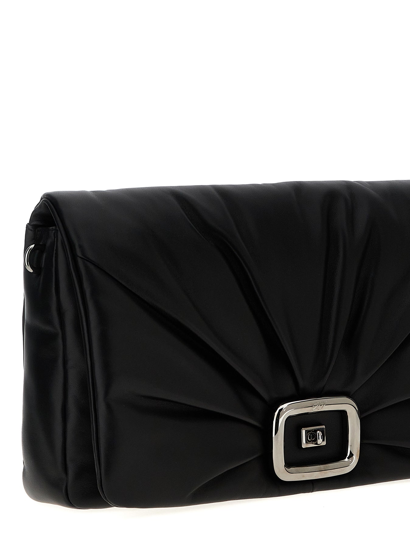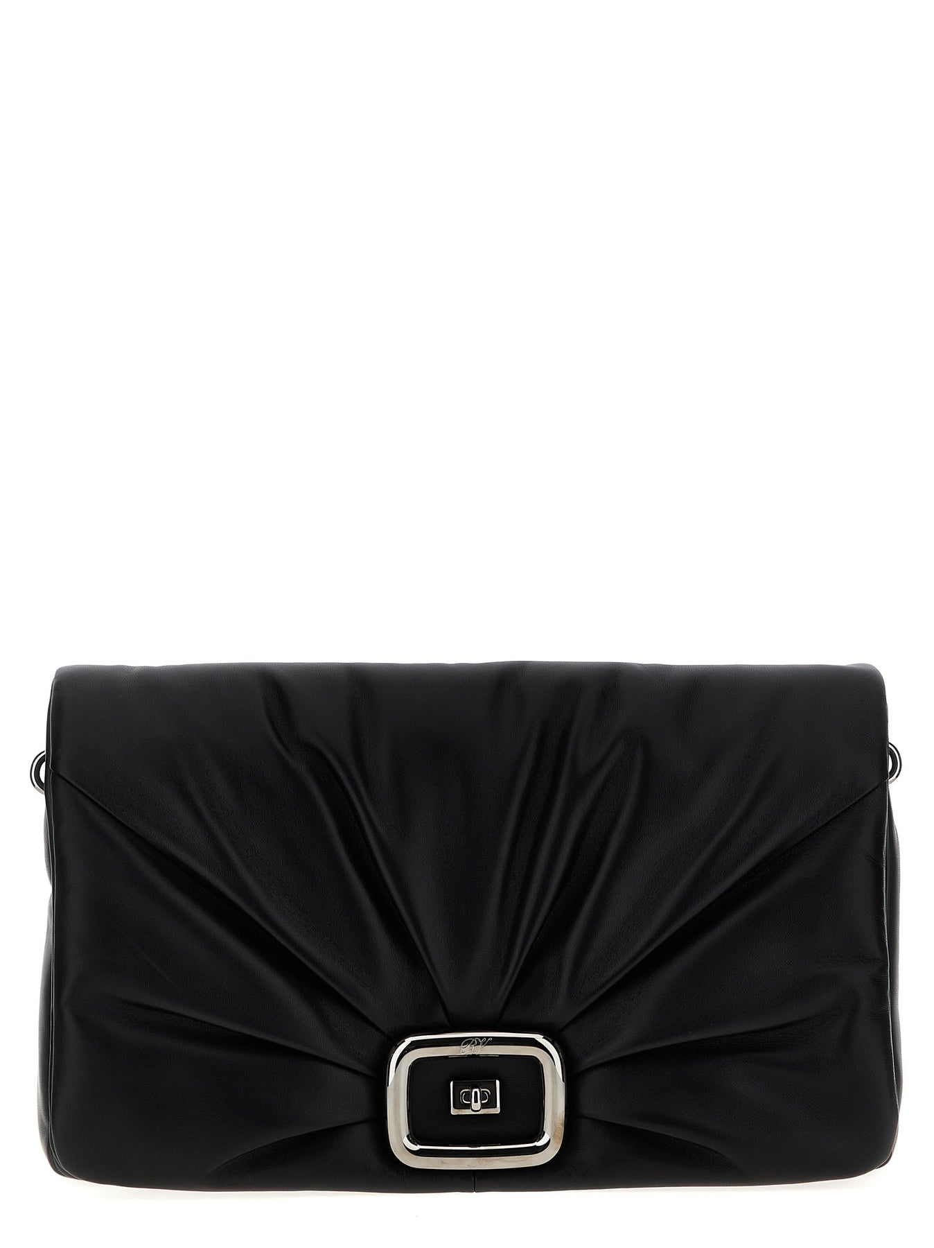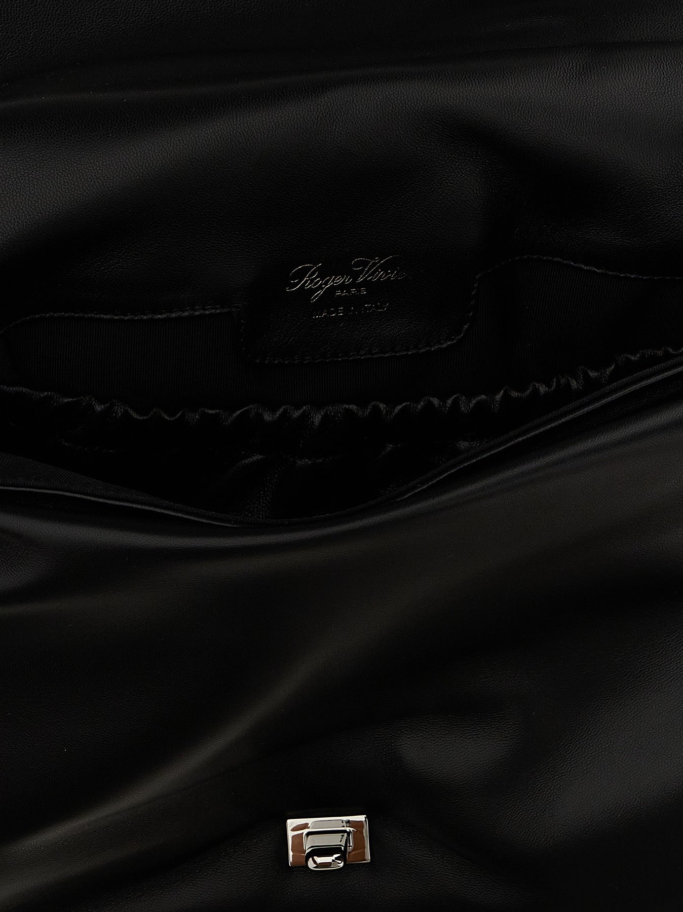 'Viv' Choc Large nappa shoulder bag with magnetic flap closure, front metal buckle appliqué, adjustable and removable leather handle, and removable chain handle.