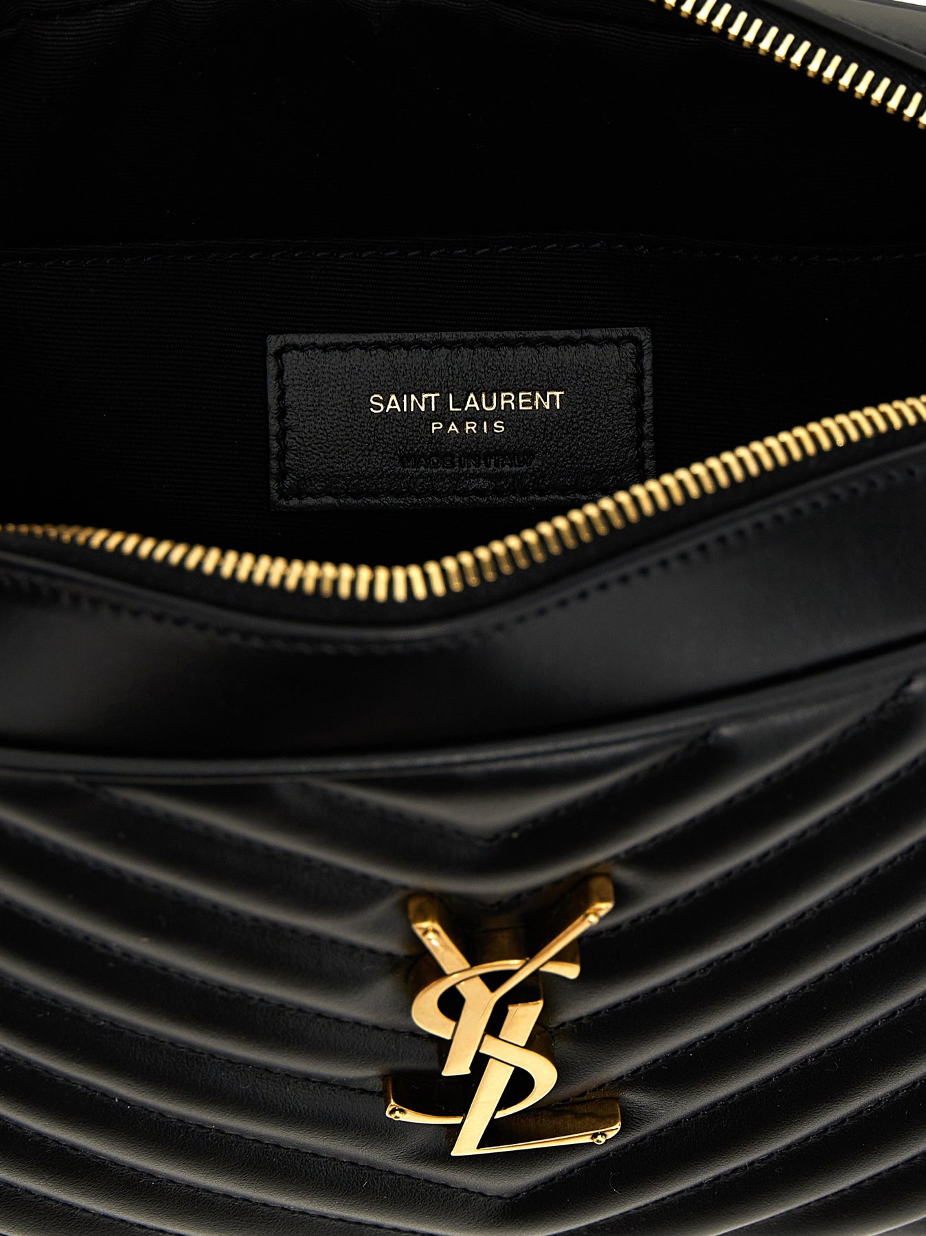 'Lou' matelassé leather crossbody bag, front logo, zip closure, adjustable shoulder strap.