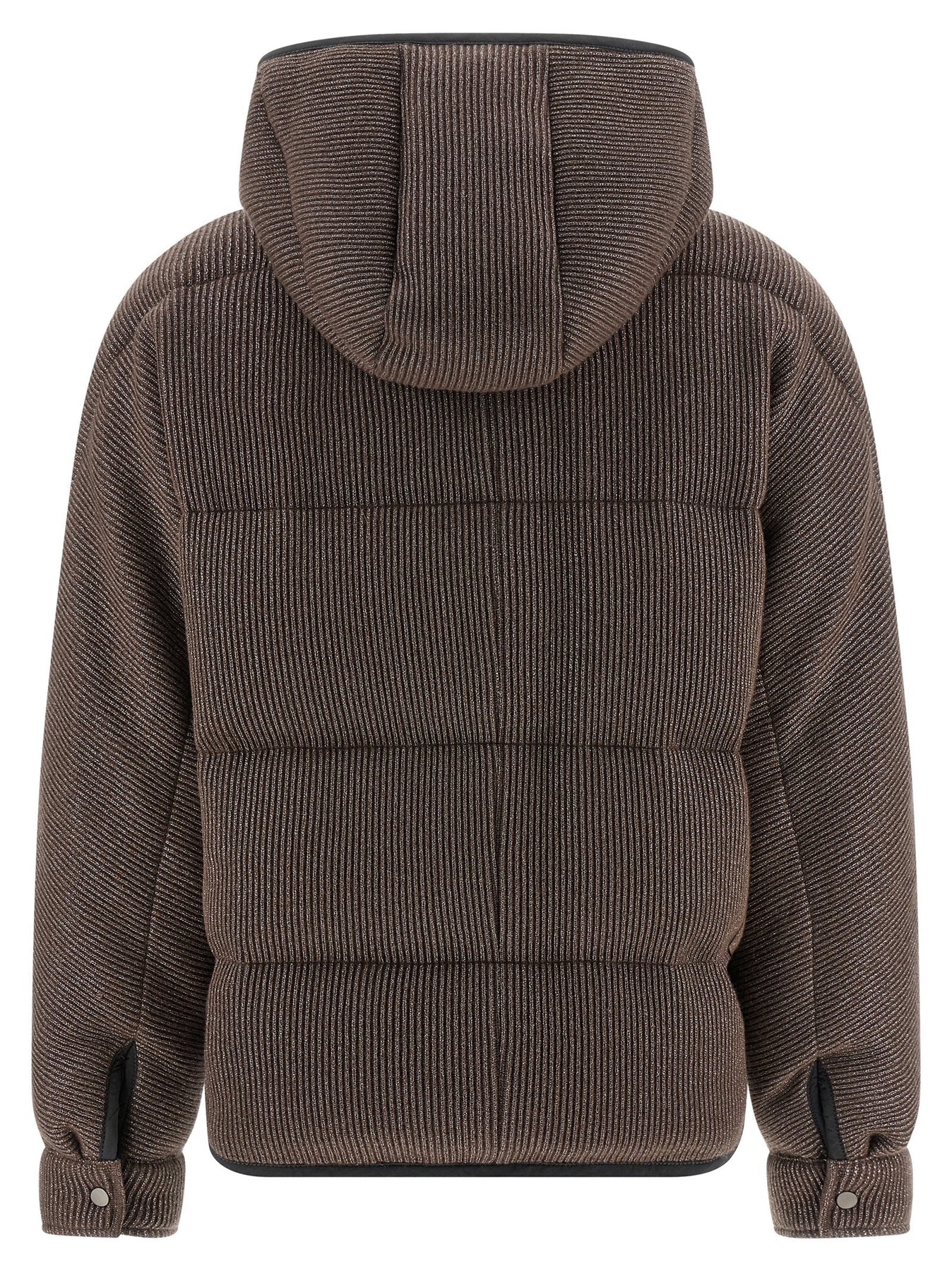 Ribbed wool down jacket with lamé threads, quilted nylon lining with goose down padding, hood, high neck, front zip closure, pockets, long cuffed sleeves, side slits, asymmetrical hem.