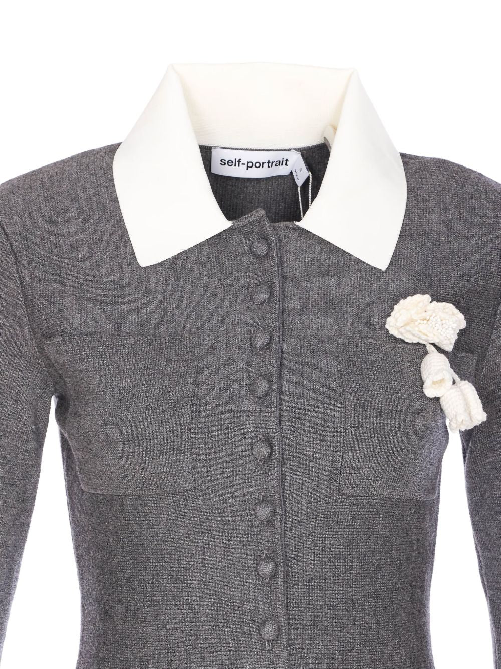 grey crochet flower embellishment collared neckline button front fastening long sleeves patch pockets