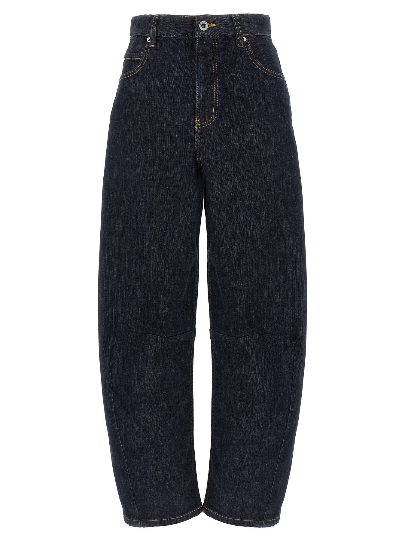 High-waisted cotton denim jeans Indigo Barrel Leg with contrast stitching, curved leg, zip and front button closure, and five pockets.