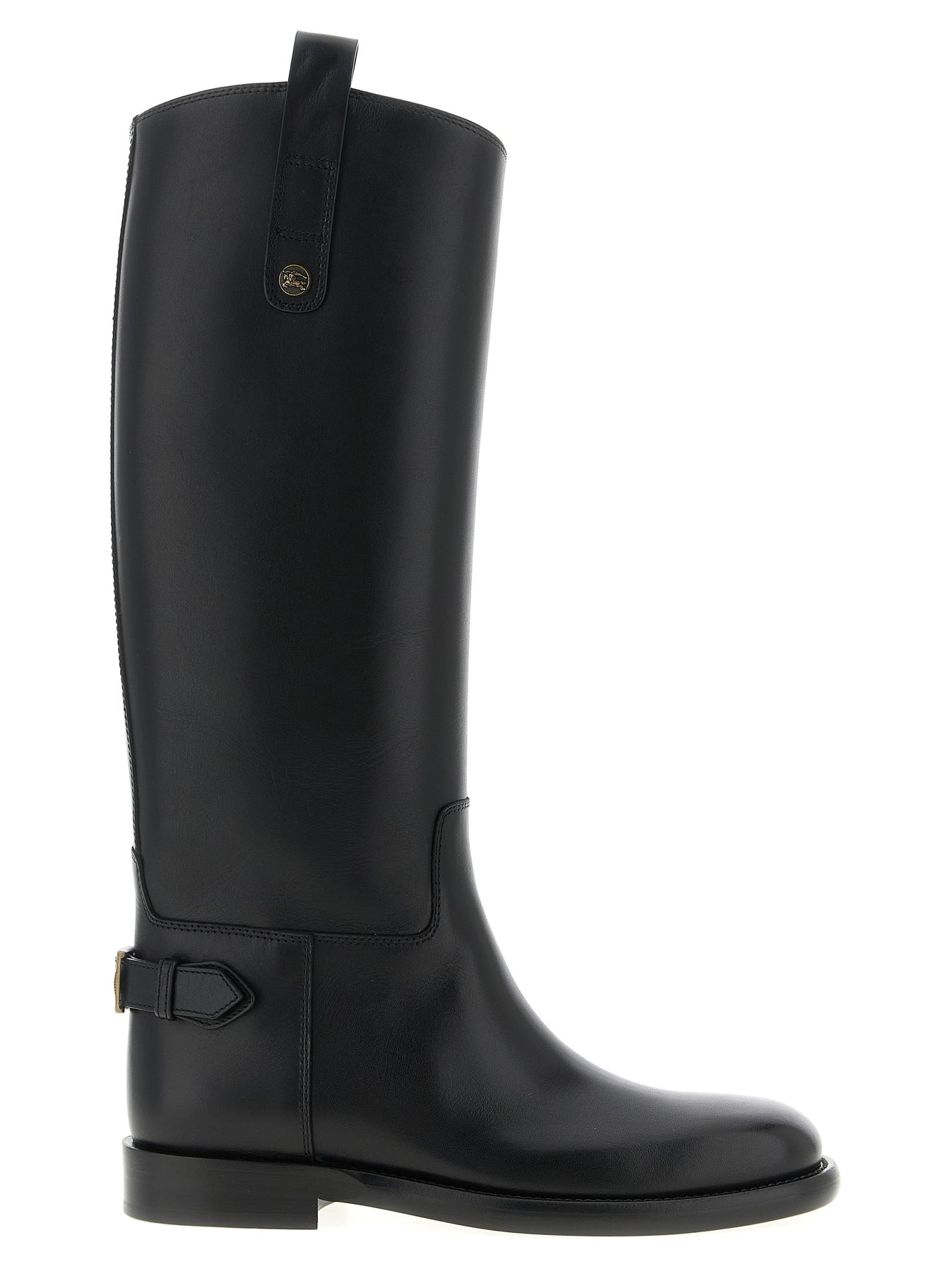 'Cavalier' smooth calf leather boots with column leg, round toe, adjustable back strap, metal button tongue with engraved 'Equestrian Knight Design', leather sole.