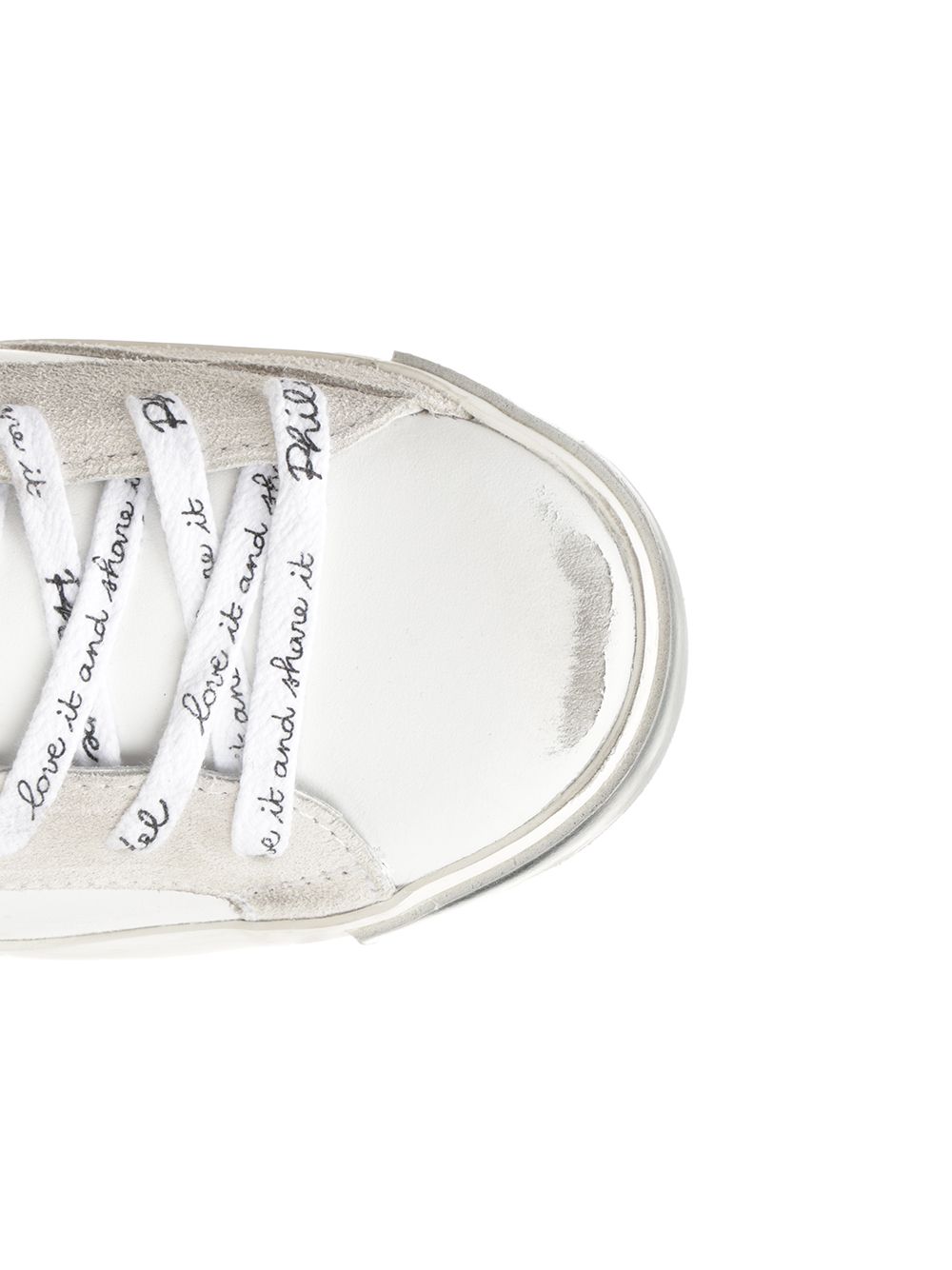 Philippe Model "Prsx" sneakers in white leather with silver details and a worn-effect sole, featuring the classic shield on the side, metal eyelets and flat laces, on the back there is a leather insert with black writing.