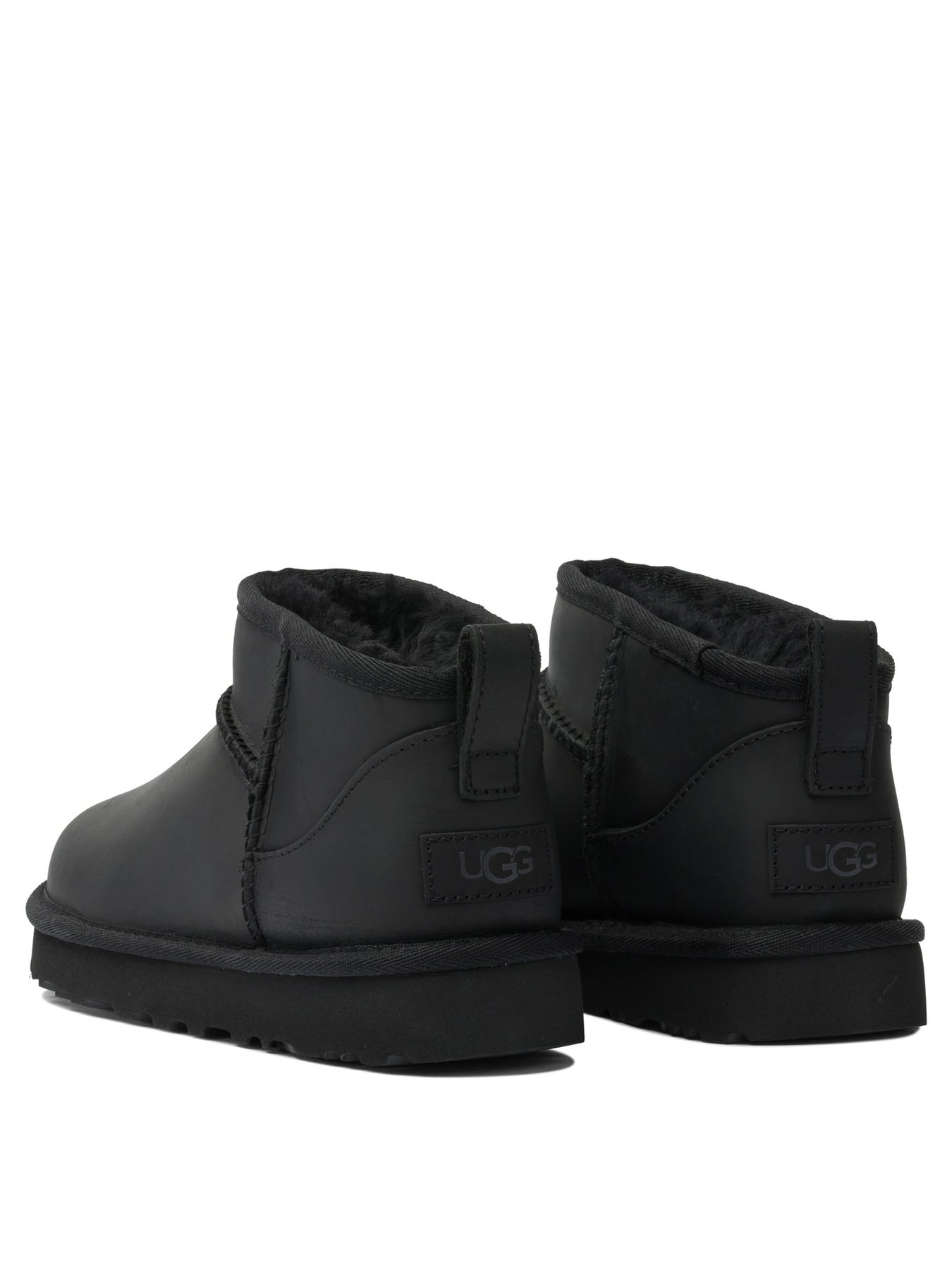 Ugg "Classic Ultra Mini" ankle boots, made with smooth leather upper and compact construction. The shaft is reduced compared to traditional models, with asymmetrical upper edge designed to facilitate the fit. The inner lining is made of genuine sheepskin or lamb fur, subjected to artificial treatment and dyeing. The sole is made of EVA derived from sugarcane to ensure lightness and flexibility. Contrasting edge made of 100% recycled polyester fabric. || - Leather upper - Genuine sheep or lamb fur lining - Sugar cane EVA outsole - Asymmetrical top edge - Rear pull tab - Woven edge with recycled polyester fibers (100%) - Leather label with embossed Ugg logo on the heel
