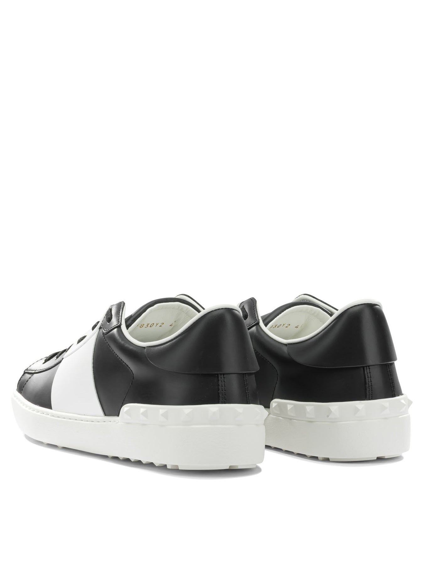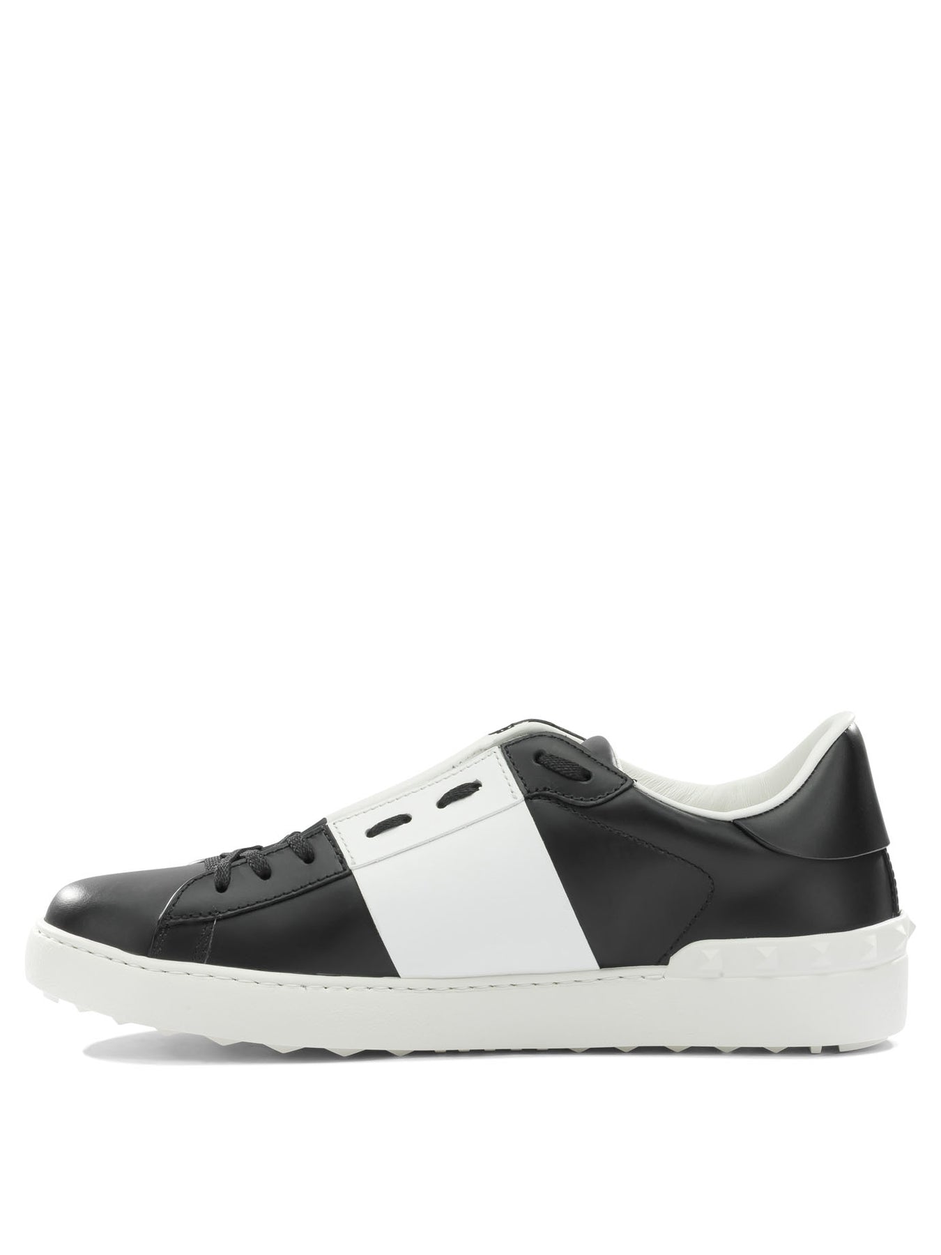 Valentino Garavani "Open" sneaker features a calf leather upper with a uniform surface and linear structure. The silhouette is rounded at the front, with a contrasting leather center band integrated into the construction. The closure is provided by flat laces, while the smooth rubber sole extends to the back, where rubber studs are applied as a functional detail. The inner lining is made entirely of leather. || - Calf leather upper - Contrasting leather center band - Rubber sole with stud detail on the back - Leather lining - Flat lace-up closure - Valentino Garavani logo printed on tongue