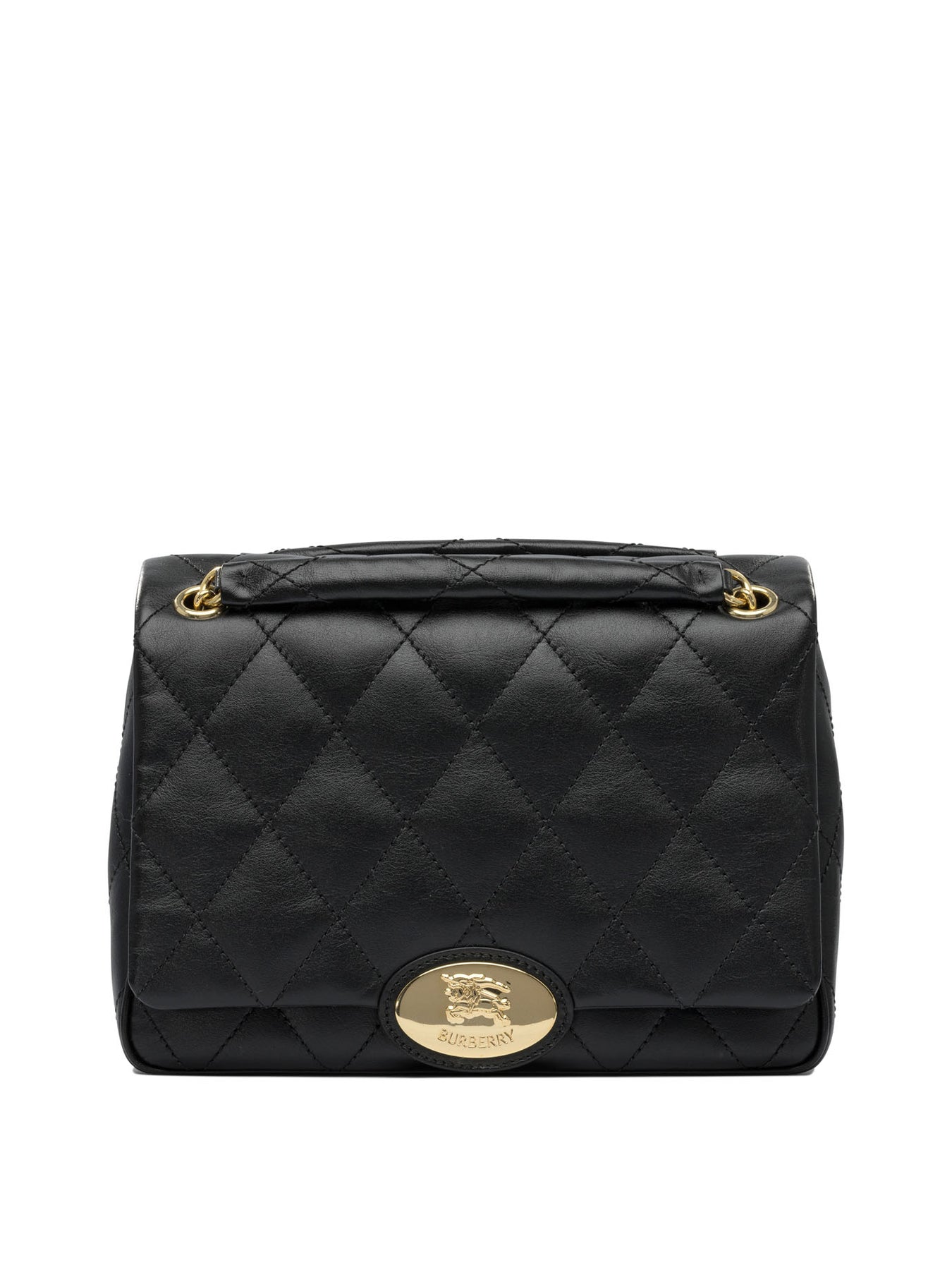 Burberry "Strand" crossbody bag constructed from quilted calfskin leather treated to achieve a soft textured finish. The compact structure features a rigid silhouette with a fold-over flap and concealed magnet closure. The adjustable shoulder strap combines metal chain and leather elements. Hand-painted edges and brushed metal details complete the functional design. || - Knight Stamp metal engraved on the front - Adjustable chain and leather shoulder strap - Turn-up flap with magnetic closure - Interior zippered pocket - Cotton lined interior - Hand-painted edges