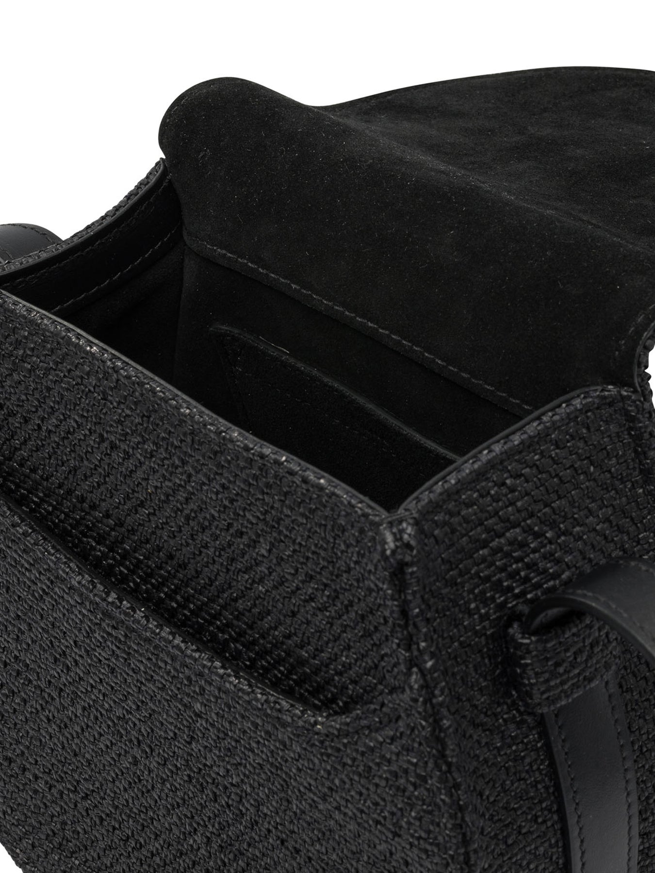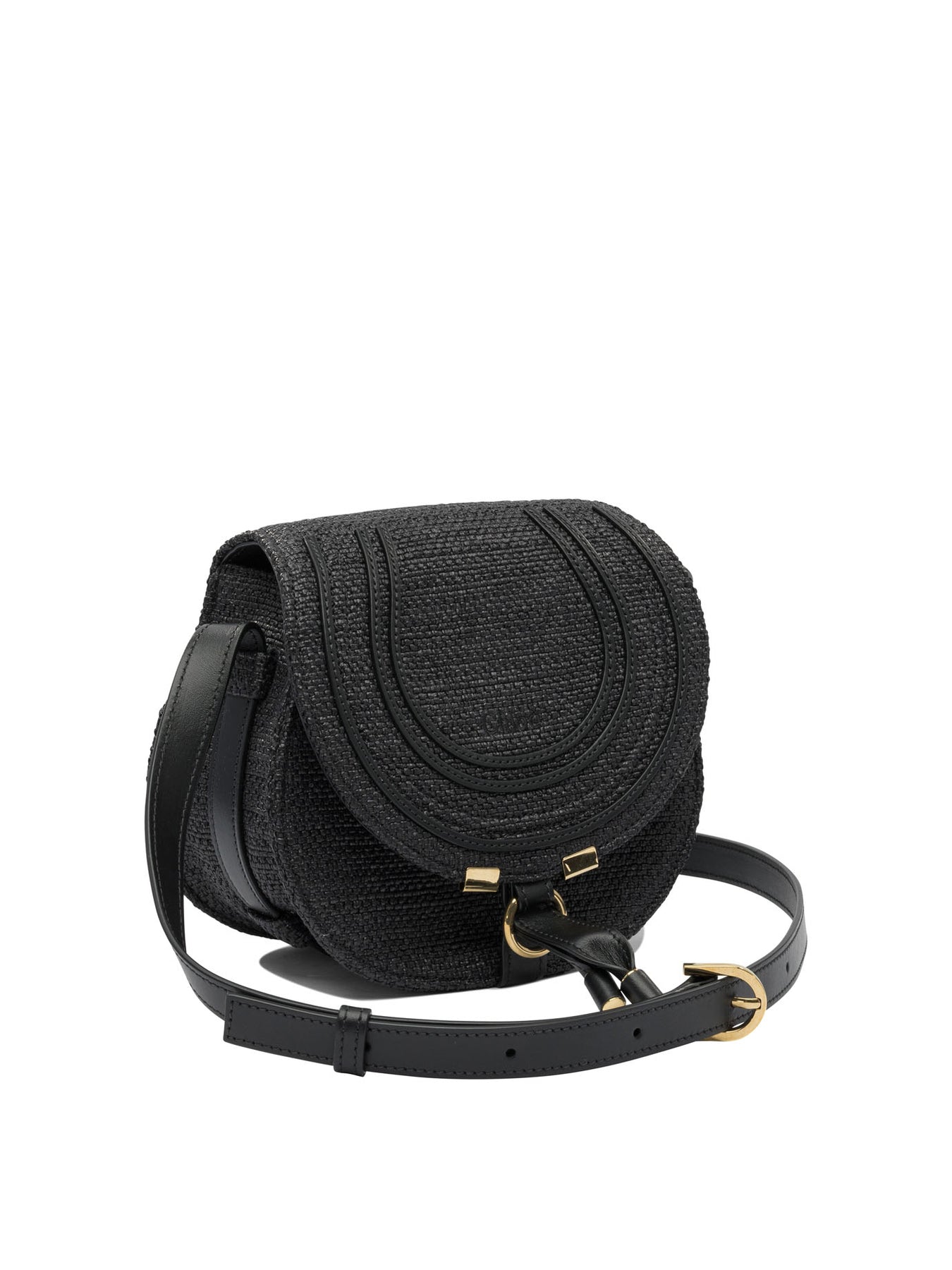 Chloé "Saddle Marcie" crossbody bag made of raffia-effect fibers with a sharp top profile and curved silhouette. The front flap, secured with leather tassels, integrates a calfskin decoration and saddle stitching recognizable from the line. Rigid structure features roomy main compartment and essential structural details. Adjustable leather shoulder strap that allows for different modes of use. || - Raffia-effect fiber exterior - Flap with tassels and calfskin decoration - Iconic saddle stitching on the flap - Adjustable leather shoulder strap, crossbody or shoulder wearable - Open front pocket - Interior flat compartment for cards - Interior fabric lining