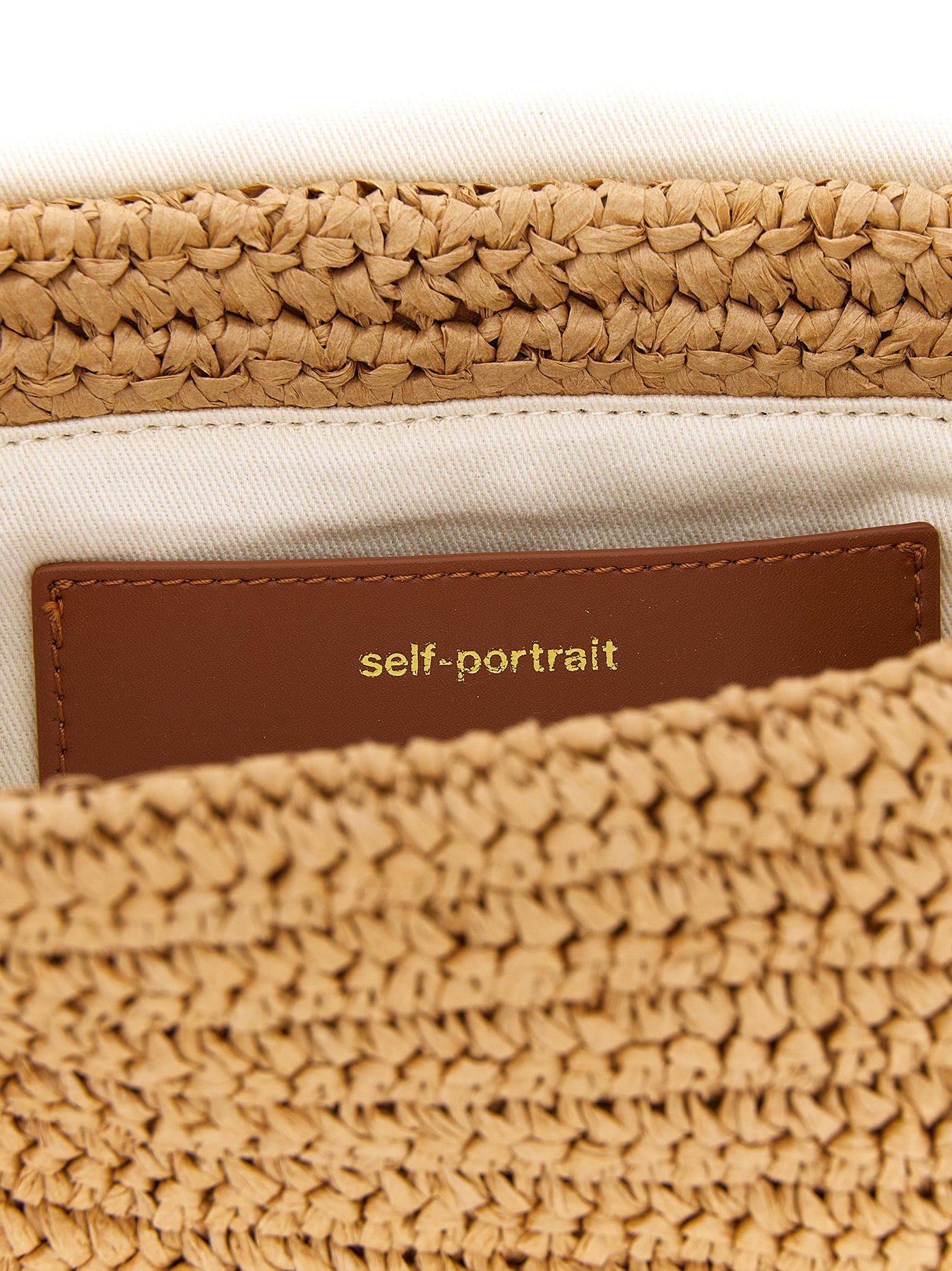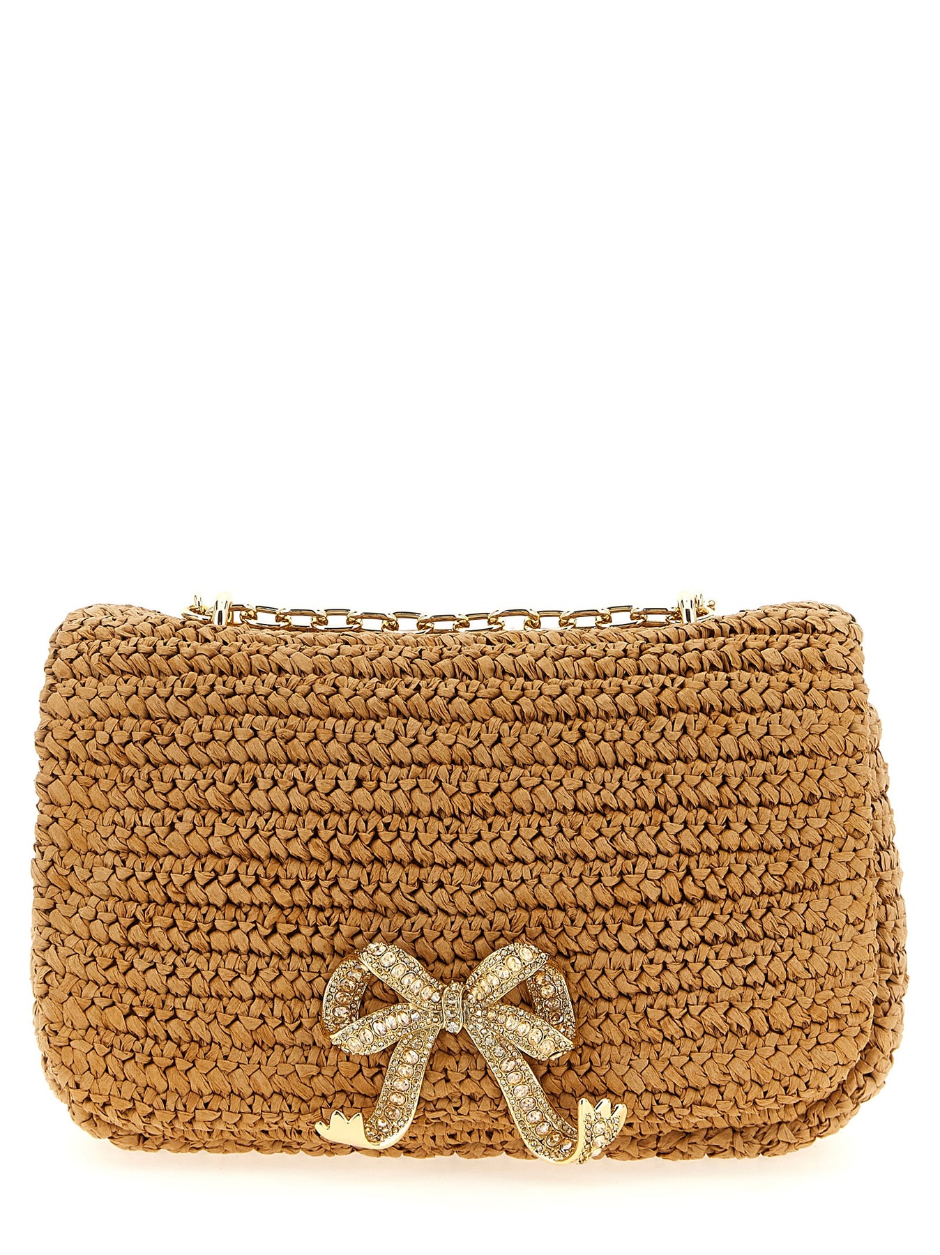 'Raffia bow charm' raffia shoulder bag with magnetic front closure, metal bow detail with rhinestones, metal chain shoulder strap with charms. Handcrafted product, any imperfections are to be considered characteristics of uniqueness.