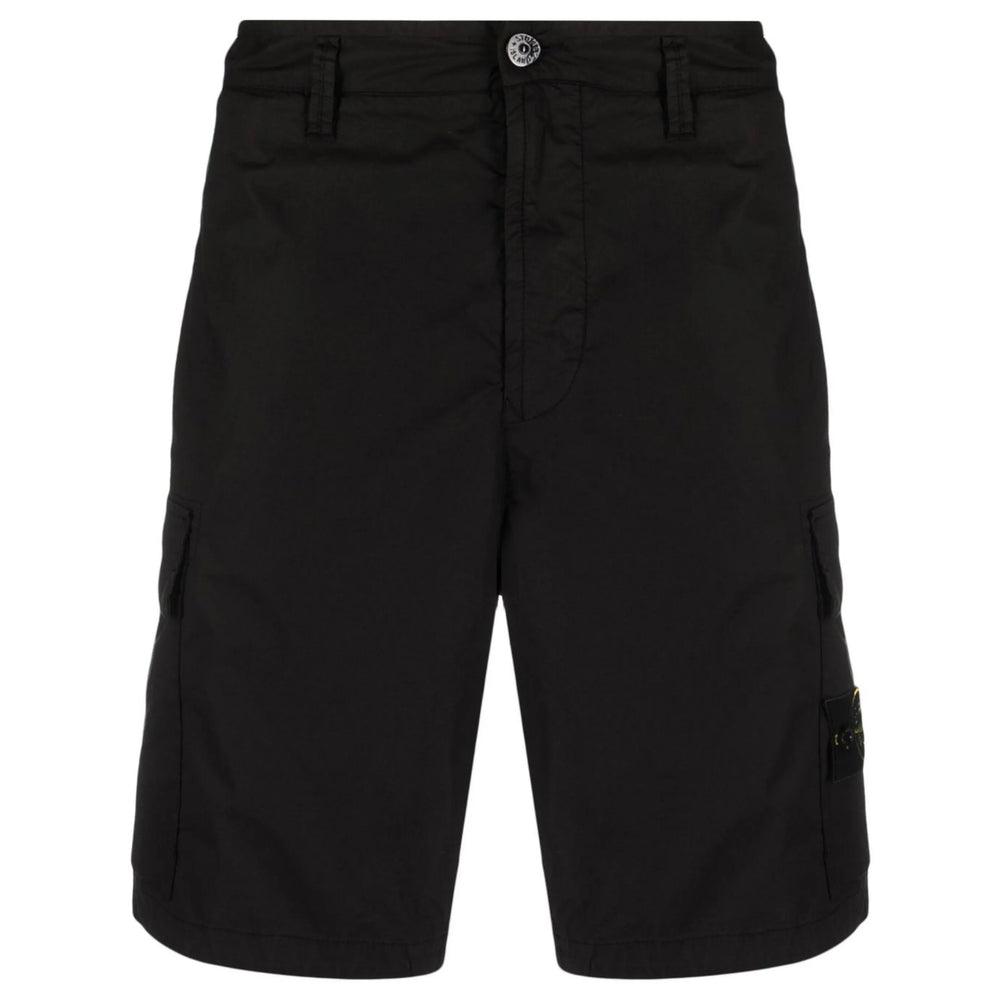 black stretch-cotton signature Compass motif belt loops front button and zip fastening two side cargo pockets rear welt pocket