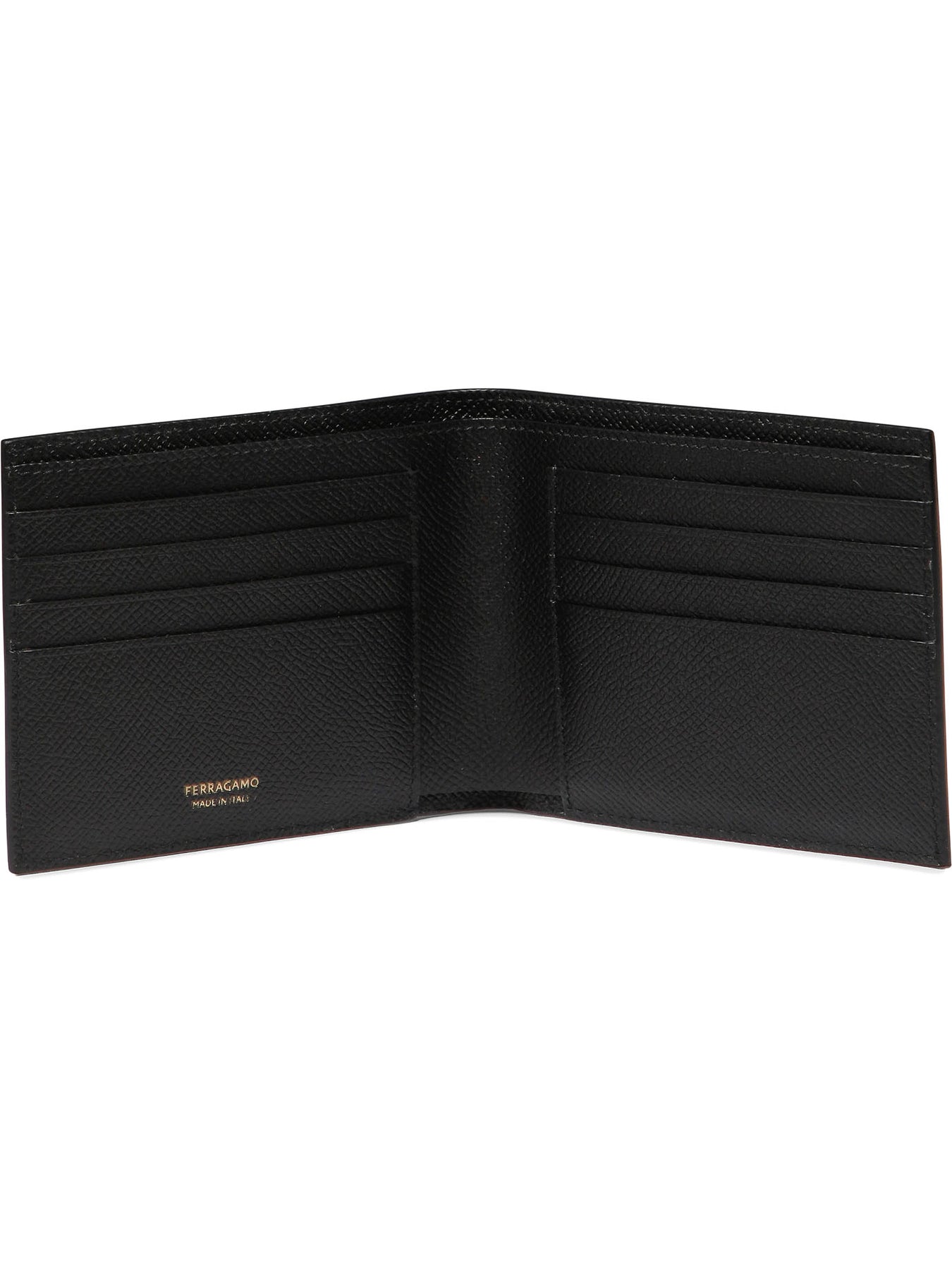 Ferragamo "Gancini" wallet, constructed of natural-grained grained calfskin with slim silhouette. The metal Gancini ornament is positioned on the front. The interior houses a bill compartment, several flat pockets for documents and horizontal slots for credit cards. The structure is rigid and defined, with no visible stitching and tonally finished edges. || - Hammered calf leather - Folding closure - Applied metal Gancini ornament - Interior bill compartment - Internal credit card slots - Flat pockets for documents - Slim line and rigid structure - Tone-on-tone edge finish - Ferragamo trademark engraved on the inside