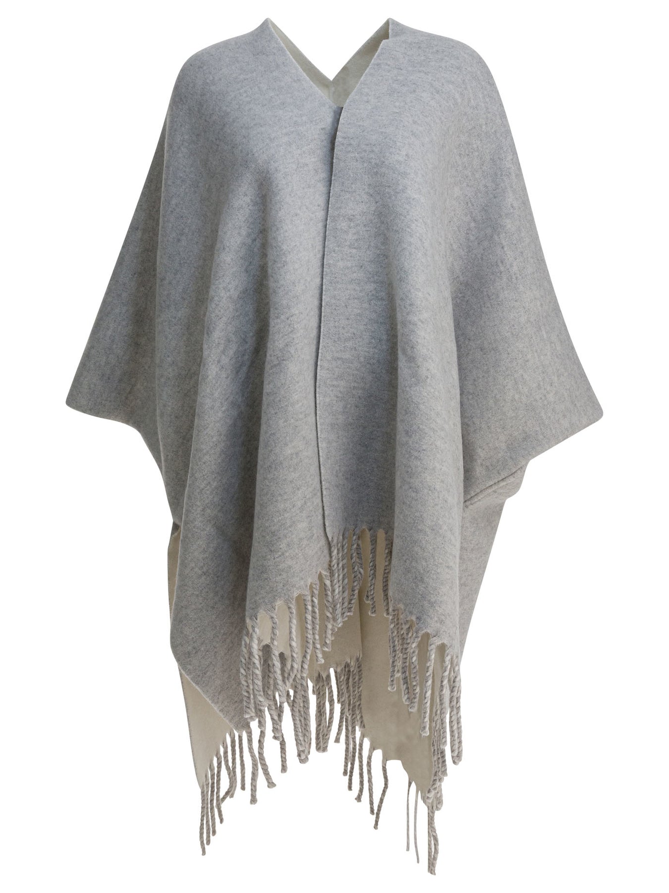 Brunello Cucinelli wool and cashmere reversible cape, constructed with double knit composed of two thin layers of wool and cashmere worked together through a manual process combined with machine action. The deconstructed structure presents a loose, flowing silhouette designed to lie on the body and follow movement. The compact fabric provides the same look on both sides, ensuring functionality and continuity of finish. || - Solid color - Wide, flowing silhouette - Reversible - Regular fit
