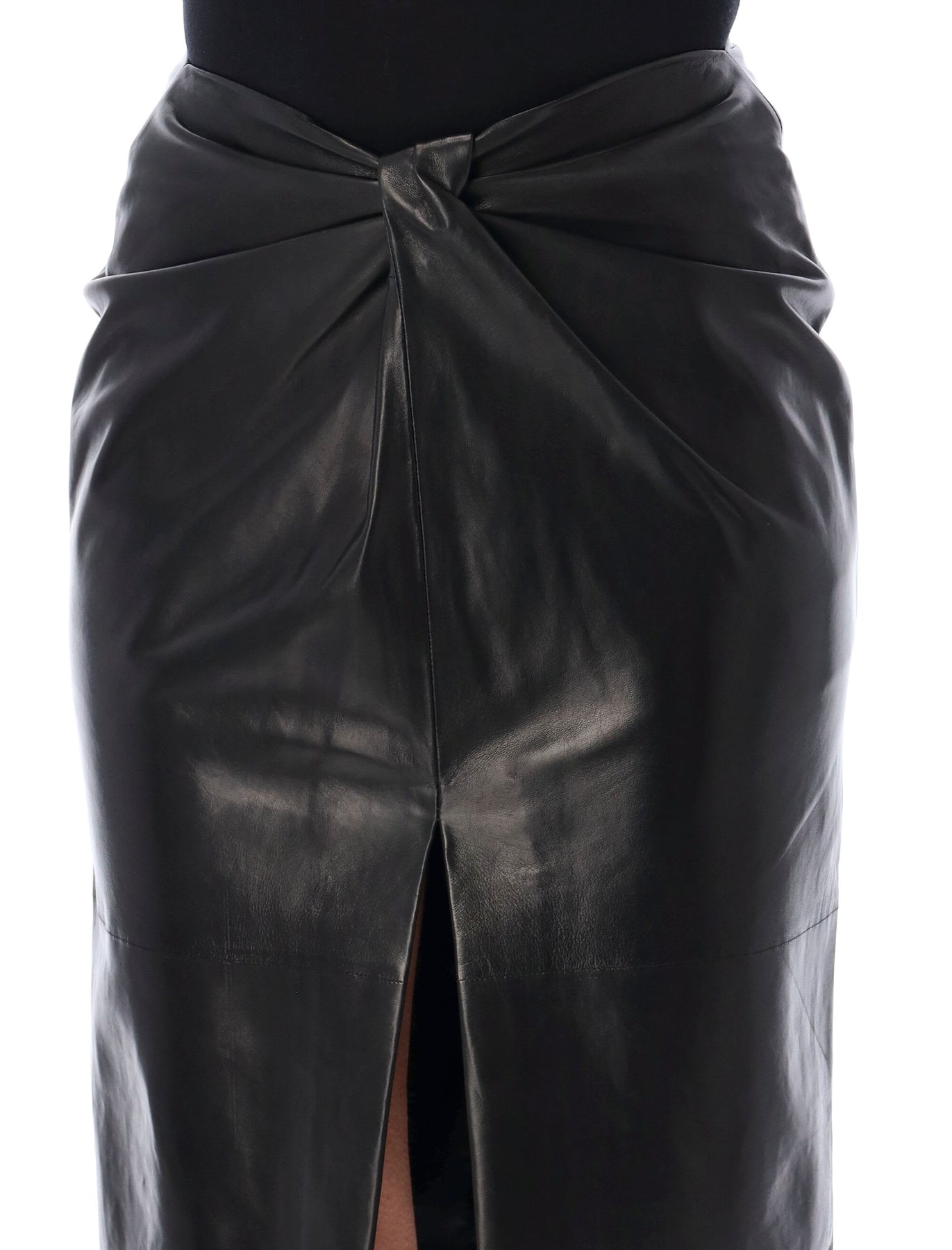 Pencil skirt in extra soft nappa leather from Saint Laurent with gathered mid-waist, front slit, zip on the back, silk lining.