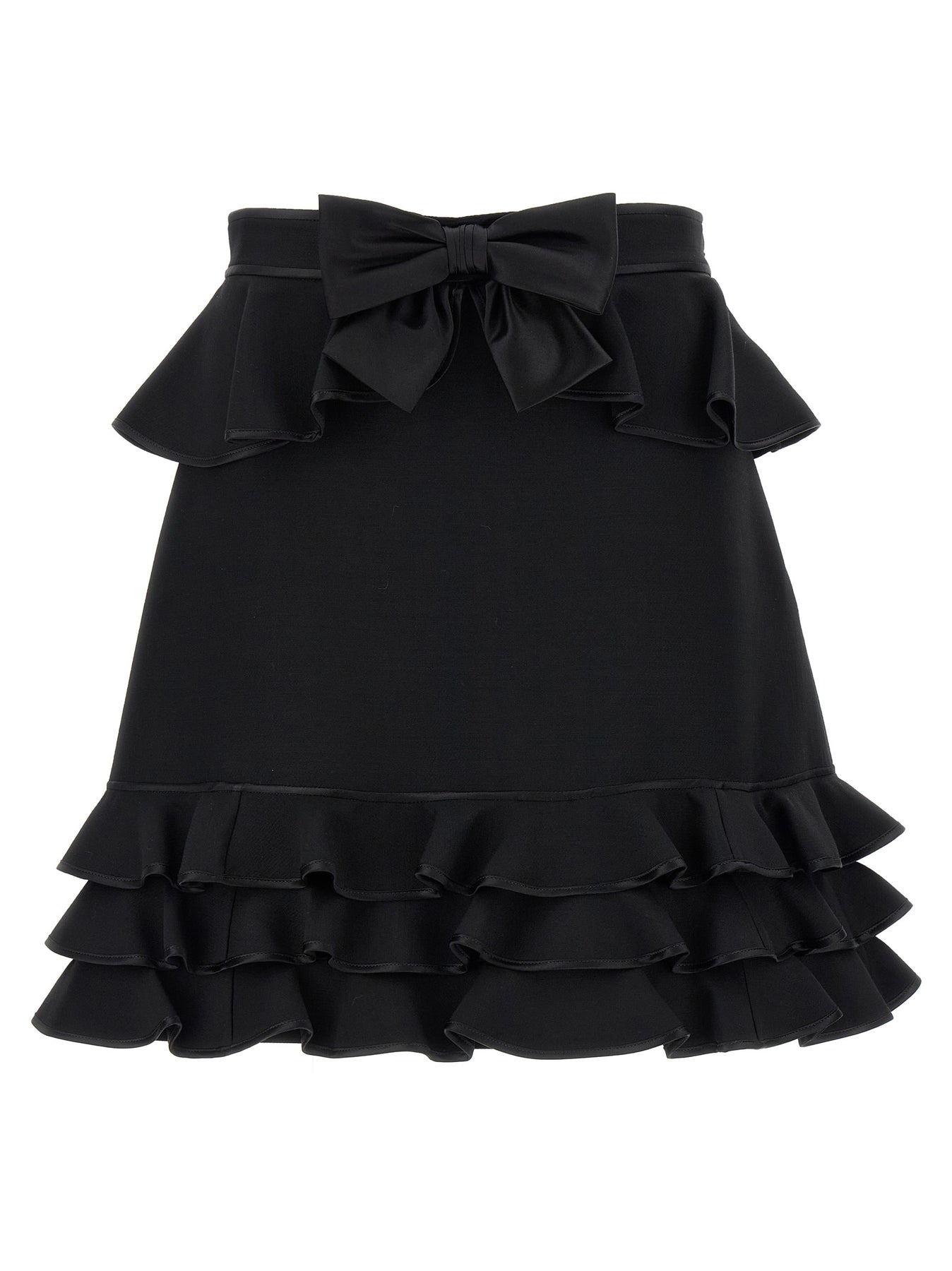 Crepe Couture mini skirt with tone-on-tone satin piping, flounces and front bow detail, side zip closure, Habotai silk lining.