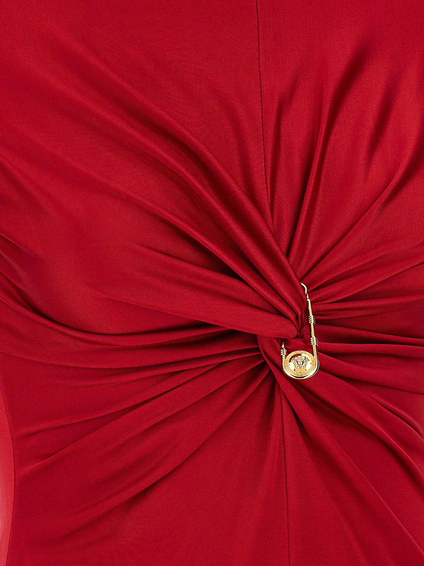 Stretch viscose jersey top with front 'Safety Pin' metallic '', crew neck, back zip closure, and short sleeves.