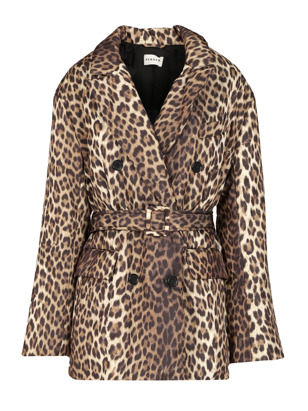 Double-breasted animalier jacket by P.A.R.O.S.H., with belt at the waist, chest pocket and side flap pockets
